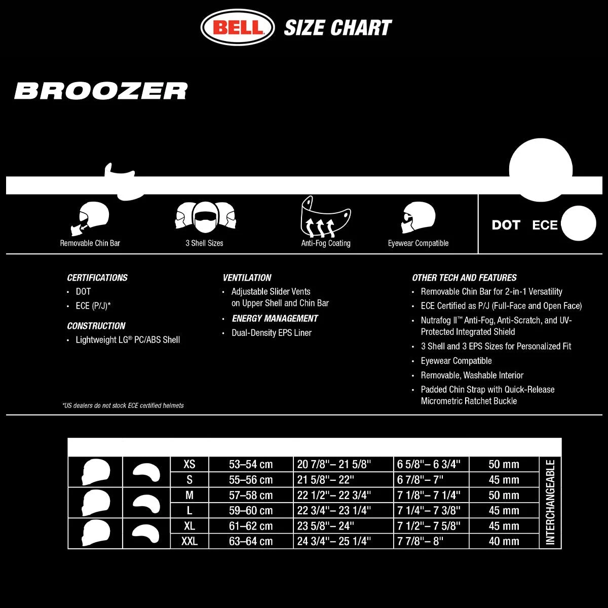 A brutal combination of attitude, style, and functionality makes the Broozer a true streetfighter. Dual-certified for both full-face and open-face riding, the removable chin bar and integrated drop-down shield means the Broozer is ready for anything. Combine this with the Bell fit you love and a lean fighting weight of 1350 grams, and you have yourself a ringer.