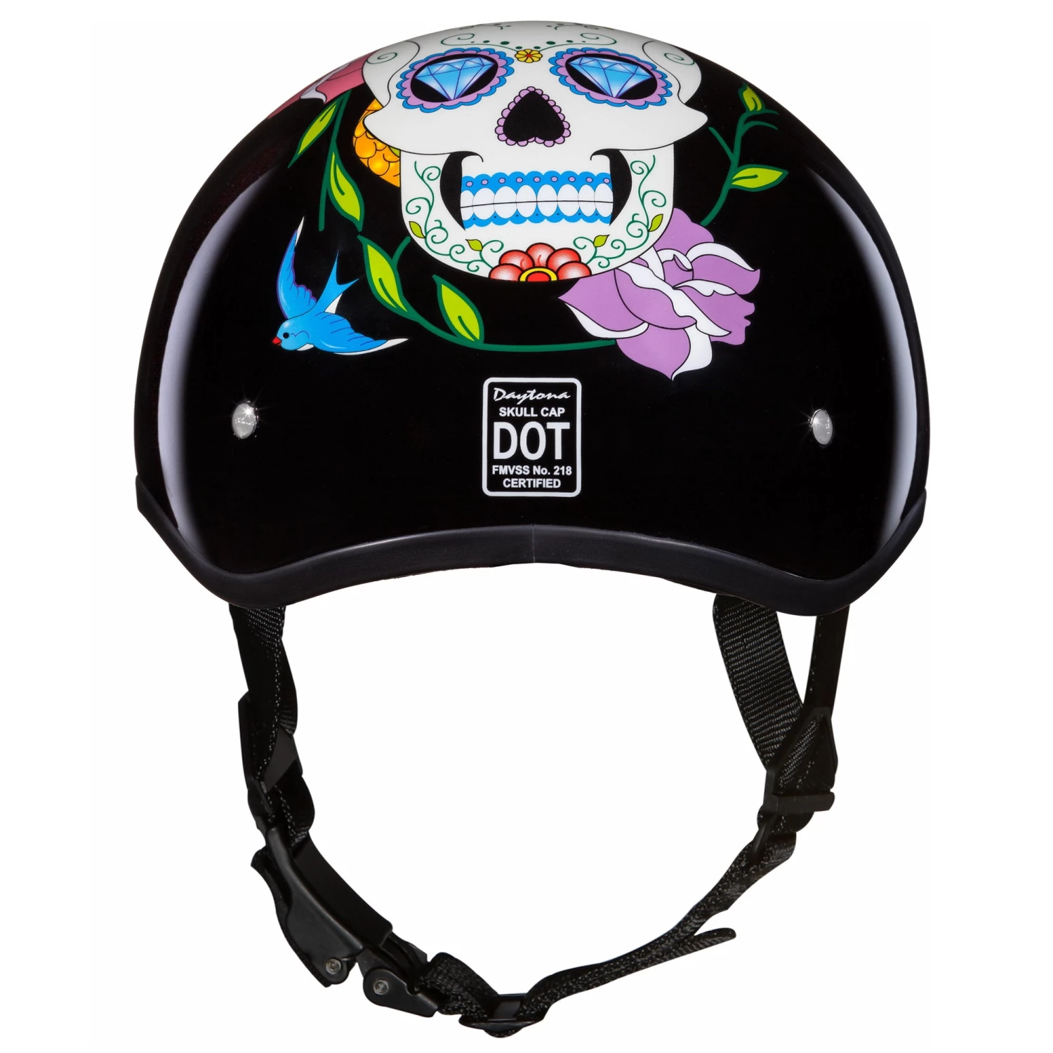 Our D.O.T. Daytona Slim Line Skull Cap 1/2 Shell Helmet in The Diamond Skull Graphic, Meets And Exceeds D.O.T. FMVSS 218 Standards and Is The Smallest D.O.T. 1/2 Shell Helmet Ever Made!! With 3 Different Shell Sizes, You’re Sure to Get That Proportionate Fit!! Each Graphic Item Is Custom Designed and May Vary in Color or Composition. Available Without Snaps/Visor Only. Many More Colors and Designs Available Such as Soft Touch Dull Black, Hi-Gloss Black, White and Pink; Custom Colors: Black Cherry, Gun Metal Grey Metallic, Pearl White and Silver Metallic; Specialty Items: Carbon Fiber and Leather. Free Head Wrap and Cloth Draw String Bag Included. Sizes Range From 2XS-2XL.