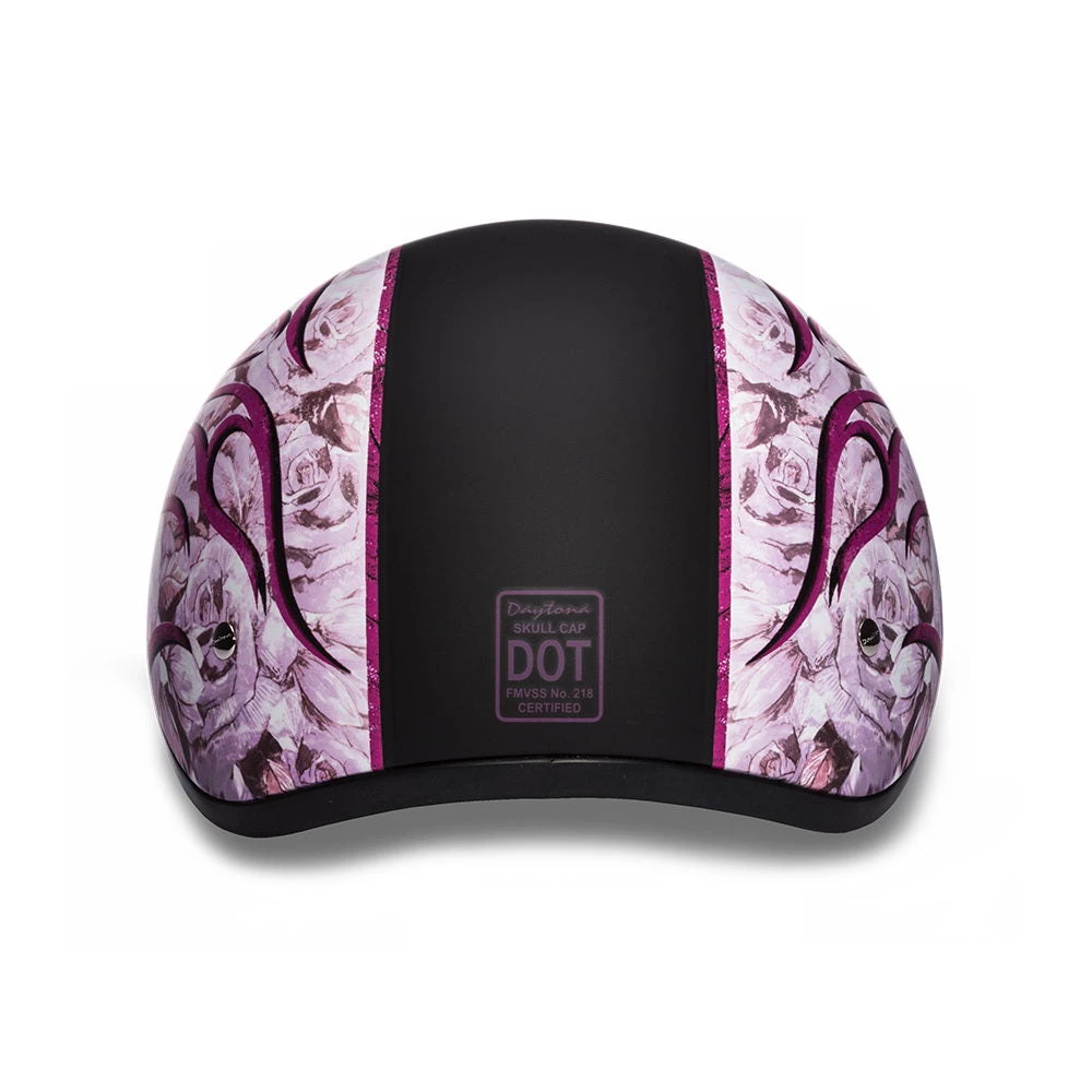 Our D.O.T. Daytona Slim Line Skull Cap 1/2 Shell Helmet in The Pink Flames Graphic, Meets And Exceeds D.O.T. FMVSS 218 Standards and Is The Smallest D.O.T. 1/2 Shell Helmet Ever Made!! With 3 Different Shell Sizes, You’re Sure to Get That Proportionate Fit!! Each Graphic Item Is Custom Designed and May Vary in Color or Composition. Available Without Snaps/Visor Only. Many More Colors and Designs Available Such as Soft Touch Dull Black, Hi-Gloss Black, White and Pink; Custom Colors: Black Cherry, Gun Metal Grey Metallic, Pearl White and Silver Metallic; Specialty Items: Carbon Fiber and Leather. Free Head Wrap and Cloth Draw String Bag Included. Sizes Range From 2XS-2XL.
