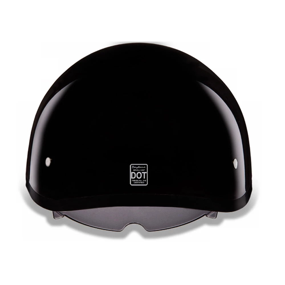 Our D.O.T. Daytona Skull Cap 1/2 Shell Helmet with Inner Retractable Smoke Shield in The Gloss Black Finish, Meets and Exceeds D.O.T. FMVSS 218 Standards. Available Without Snaps/Visor Only. It Is Also Available in Hi-Gloss Black. Free Head Wrap and Cloth Draw String Bag Included. Sizes Range From XS-XL.