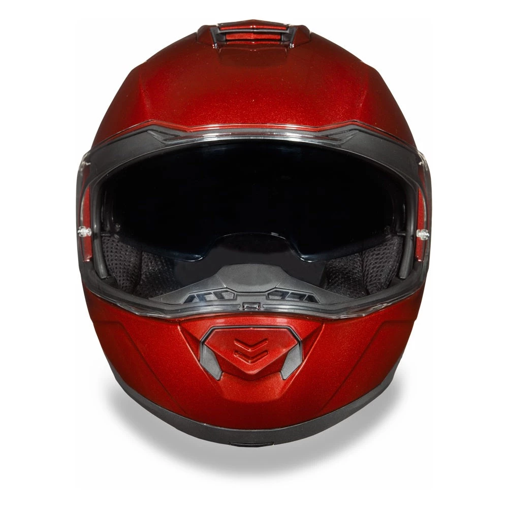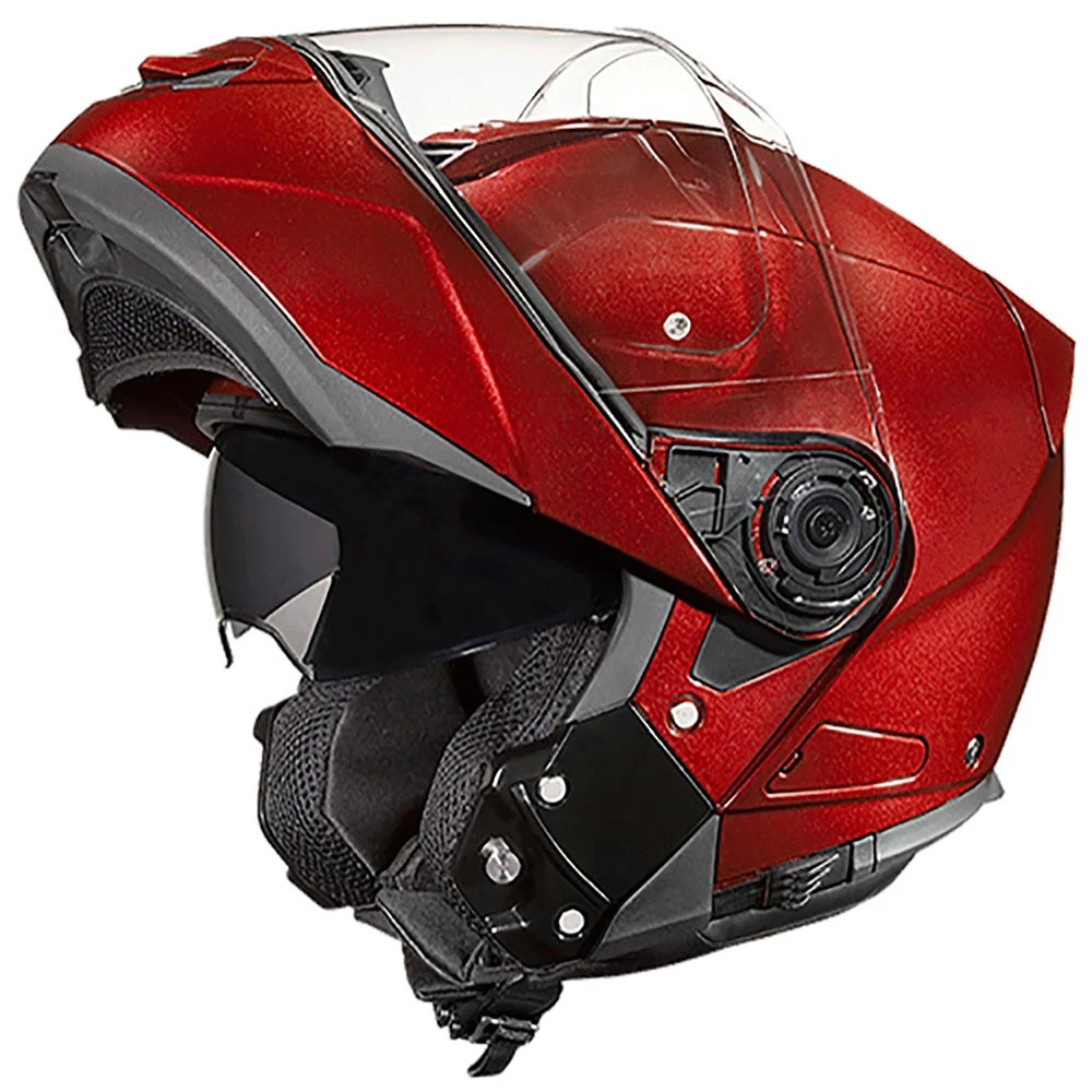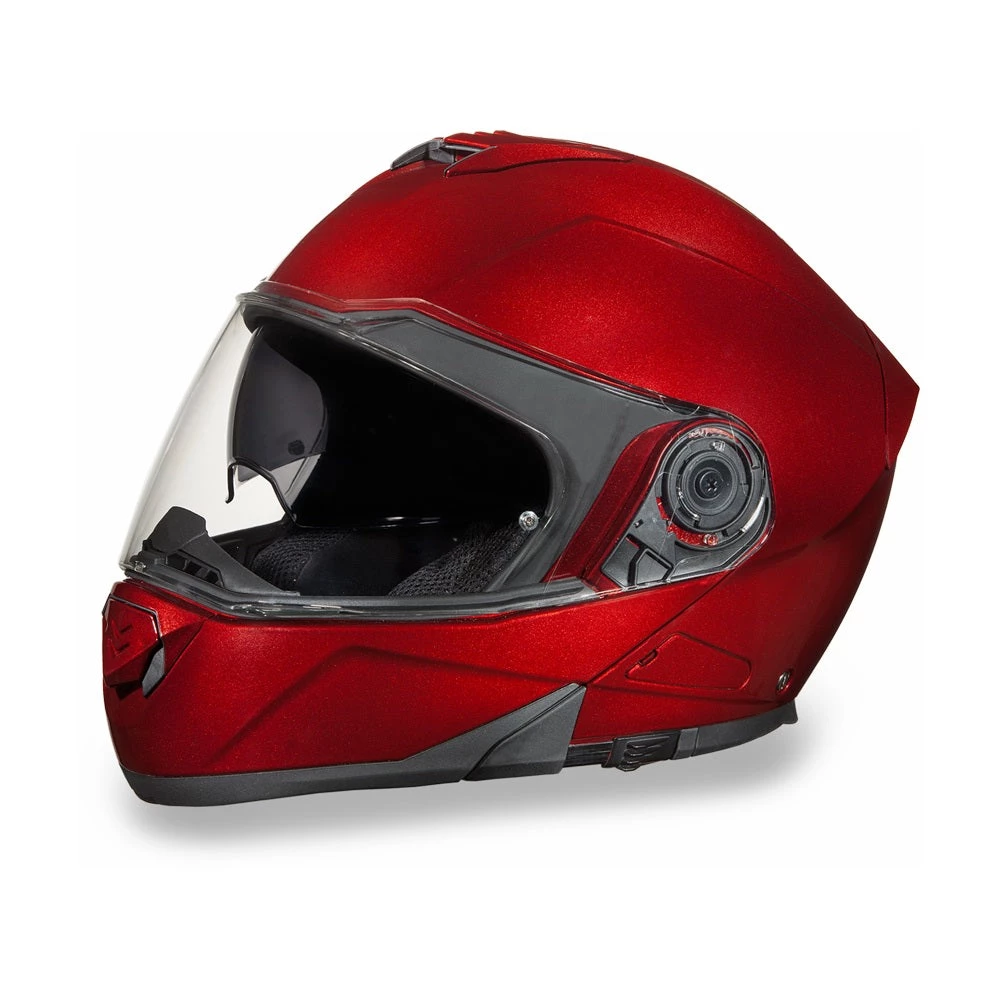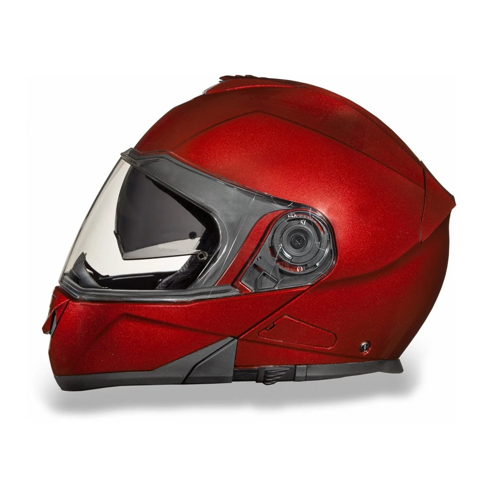Our D.O.T. Daytona Glide Modular Helmet, with Inner Anti-Scratch Retractable Smoke Shield, In a Custom Black Cherry Metallic, Meets and Exceeds D.O.T. FMVSS 218 Standards. With 2 Different Shell Sizes, You’re Sure to Get That Proportionate Fit!! This Modular Helmet Comes in A Clear Lacquer Finish. Also Available in Custom Colors: Gun Metal Grey Metallic and Silver Metallic. Basic Colors; Soft Touch Dull Black, Hi-Gloss Black and White. Features a Dual Shield System; Outer Anti-Scratch, Pinlock 30 Fitted Clear Shield and Inner Anti-Scratch Retractable Smoke Shield. Also Has A Quick Release Lock Retention System; One Finger Release Lever for Easy Detachment, Adjustable Chin and Forehead Ventilation and A Removable, Hand Washable Interior (Moisture Wicking Fabric). Bluetooth Ready. Free Head Wrap and Draw String Bag Included.
