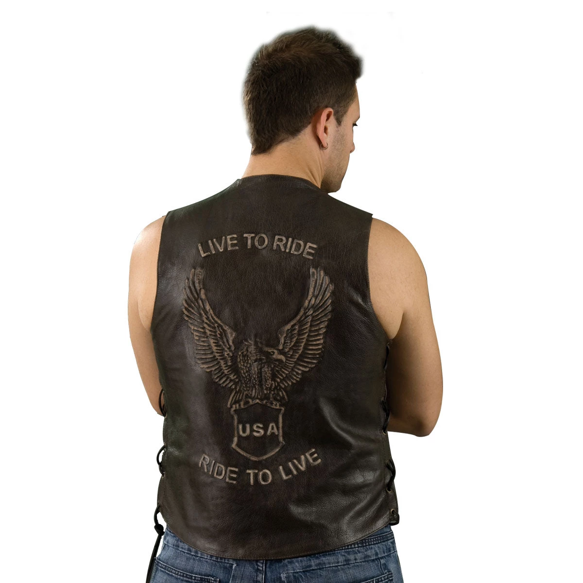 Genuine Leather ML1346RT Men’s ‘Live to Ride, Ride to Live Eagle Emboss’ Brown Leather Vest