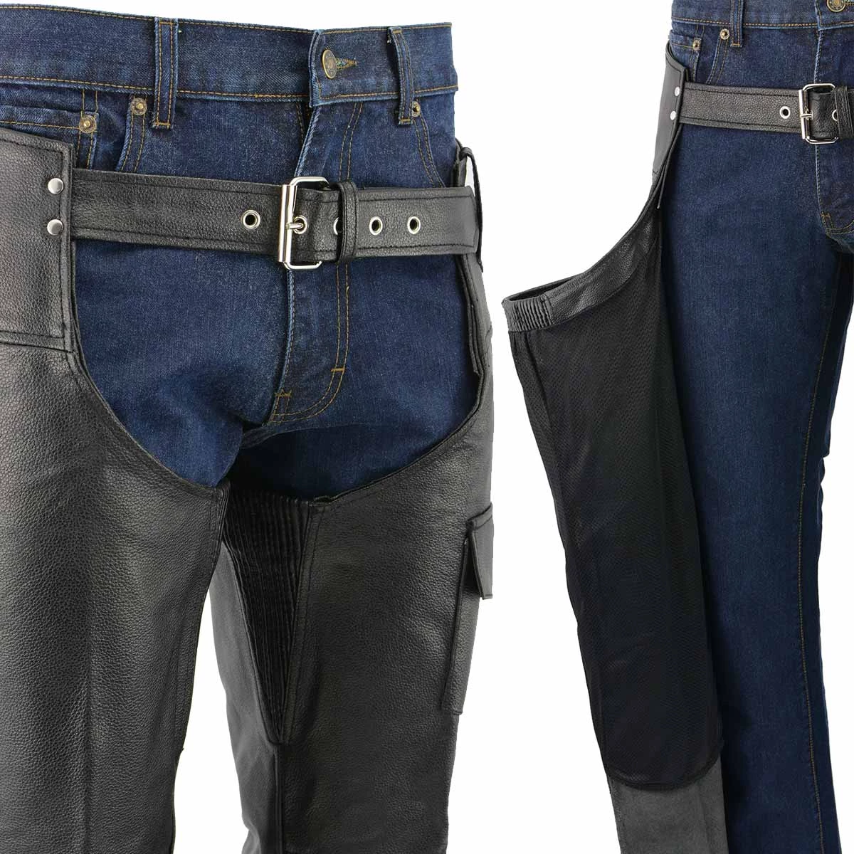 Men’s XS401 Classic Black Leather Motorcycle Chaps with Outside Flap Pocket