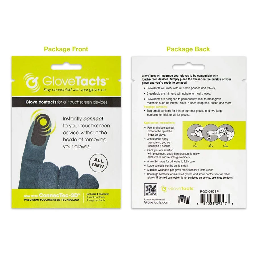 GloveTacts make most gloves touch-screen compatible. By using GloveTacts you can keep your gloves on while using touch devices, making using your devices more enjoyable and productive. GloveTacts are stickers that are easily applied to the outside of the glove wherever touch sensitivity is needed. They are designed to last and when used properly will work for as long as you have your gloves.