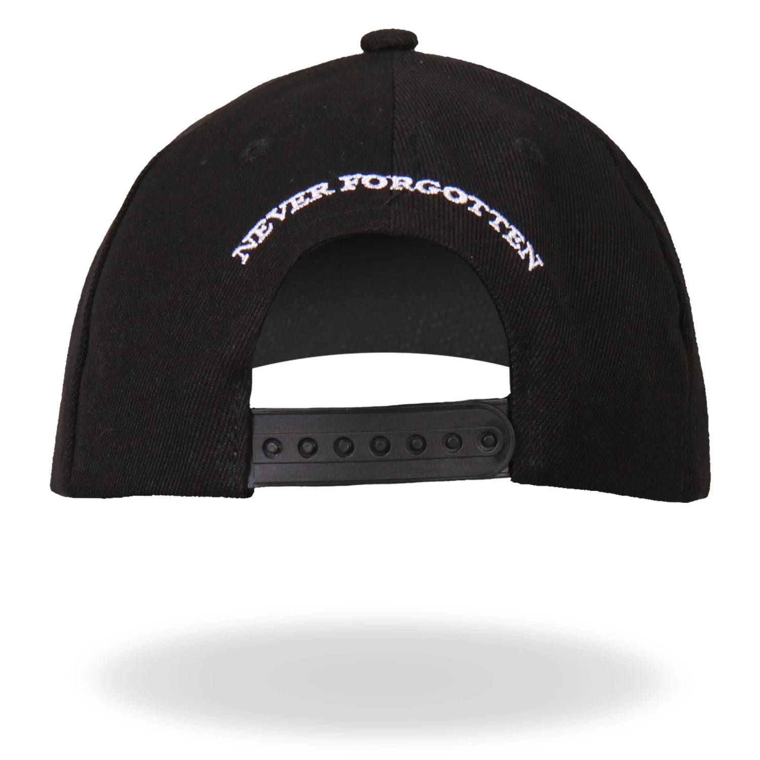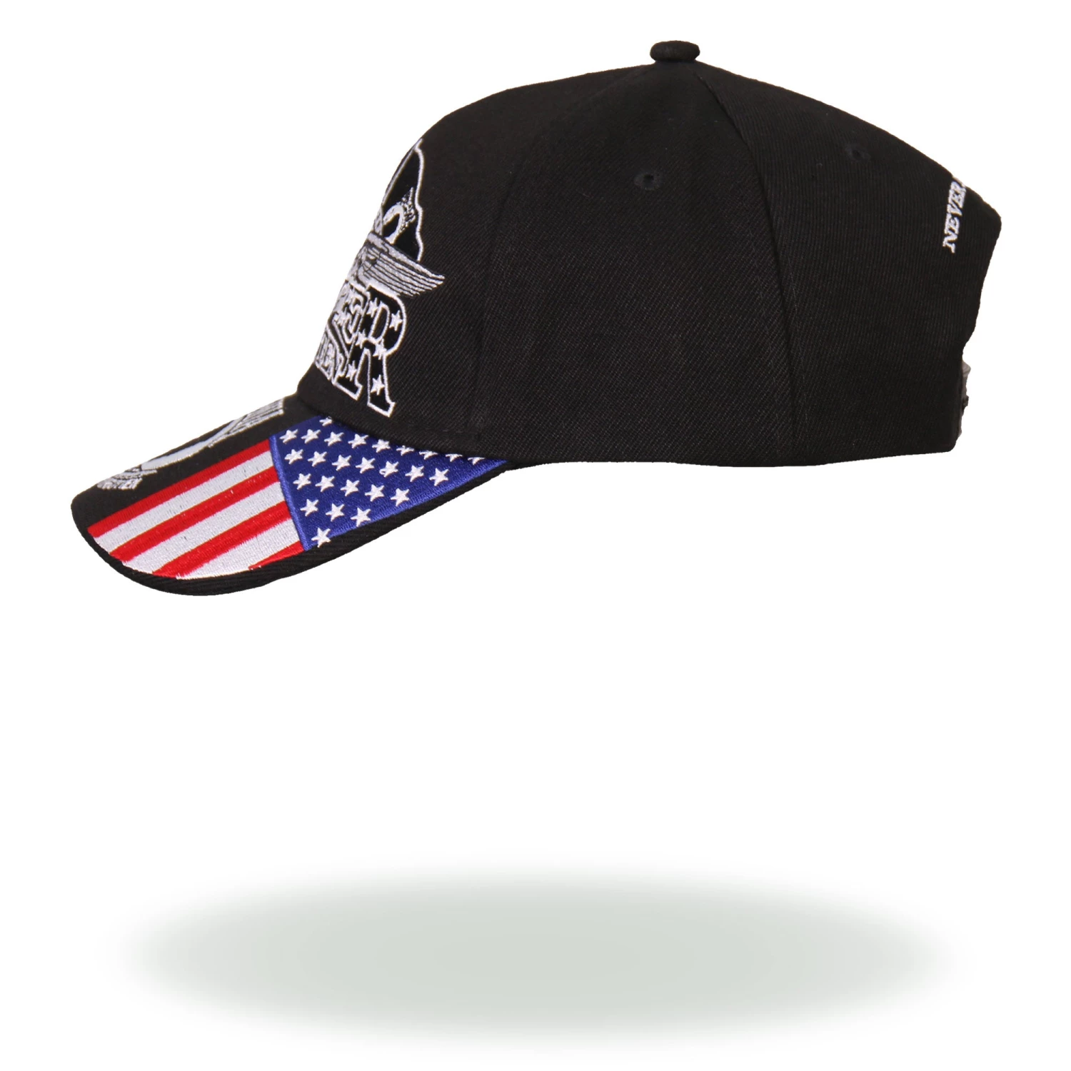 Our signature Iron Eagle POW Ball Cap features an original design on a black cap. The phrase “NEVER FORGOTTEN” is embroidered in white in the center of the cap underneath a bald eagle, crown of stars, American flag, and POW/MIA flag. The bill of the cap has American flags on either side and the POW/MIA emblem in the center, which features the phrase “YOU ARE NOT FORGOTTEN.” Wear this ball cap to add patriotism to your biker style.