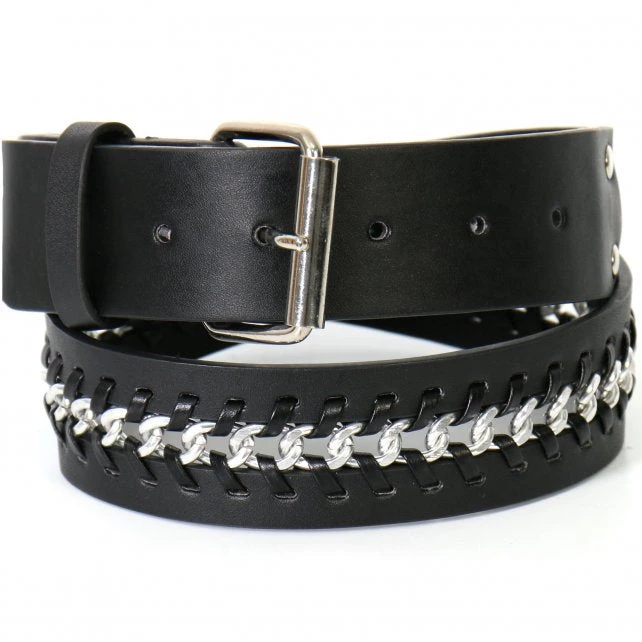 The Unisex Center Weave Black Leather Belt Contains A Creative Silver Center Weave Design with Silver Hardware. This Belt Contains A Removable Buckle Which Means It Will Fit Any of Our Exclusive Hot Leathers Belt Buckles.