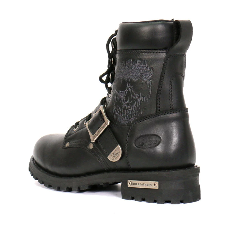 All New Men’s Logger Style Leather Motorcycle Boot. This great new design features our Classic Skull Grave Rub design. This design is embroidered directly onto the leather. Hot Leathers is proud to present our new Riding Collection of motorcycle boots for men and women. The Hot Leathers Riding Collection is a growing line of the absolute highest quality leather boots made specifically for motorcycling. Each of these motorcycle boots are handcrafted by highly skilled craftsmen and women who know what it takes to make long lasting quality footwear. All of these riding boots are water and slip resistant and use heavy duty hardware and YKK® zippers.