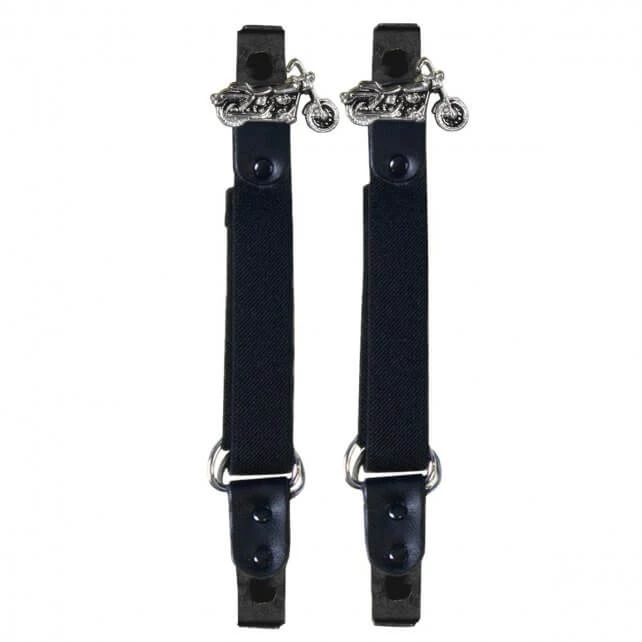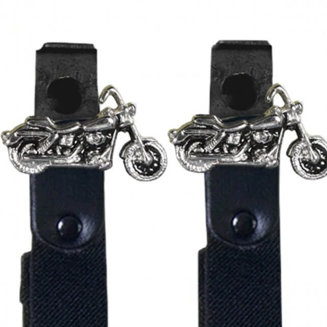 The Motorcycle Riding Pant Clips Are Manufactured in The USA And Measure 8 inches Long. These Adjustable Riding Pant Clips Are Made of Black Stretchable Bungee Material and Silver Heavy-Duty Clips with Designs. Use These Clips to Keep Your Pant Legs Down and Prevent Wind and Debris from Going Up Your Legs While Your Ride!