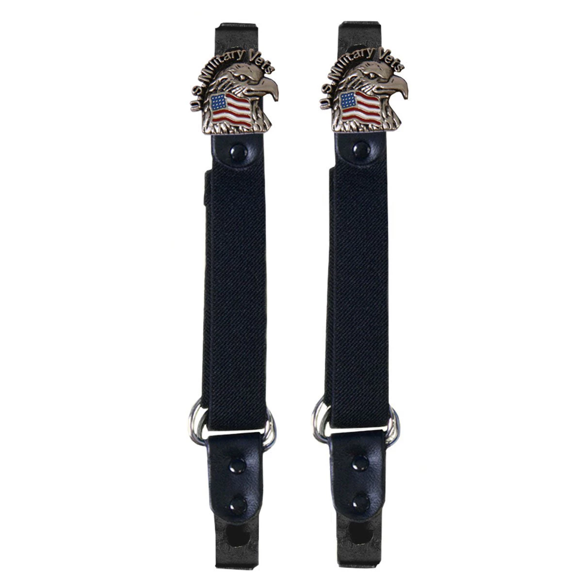 8″ Adjustable Motorcycle Riding Pant Bungees with Medallions Keep Your Pant Legs Pulled Down While Riding to Keep the Air from Rushing Up Your Legs. Made of Black Stretchable Bungee Material and Silver Heavy Duty Clips. Proudly Made In The USA!