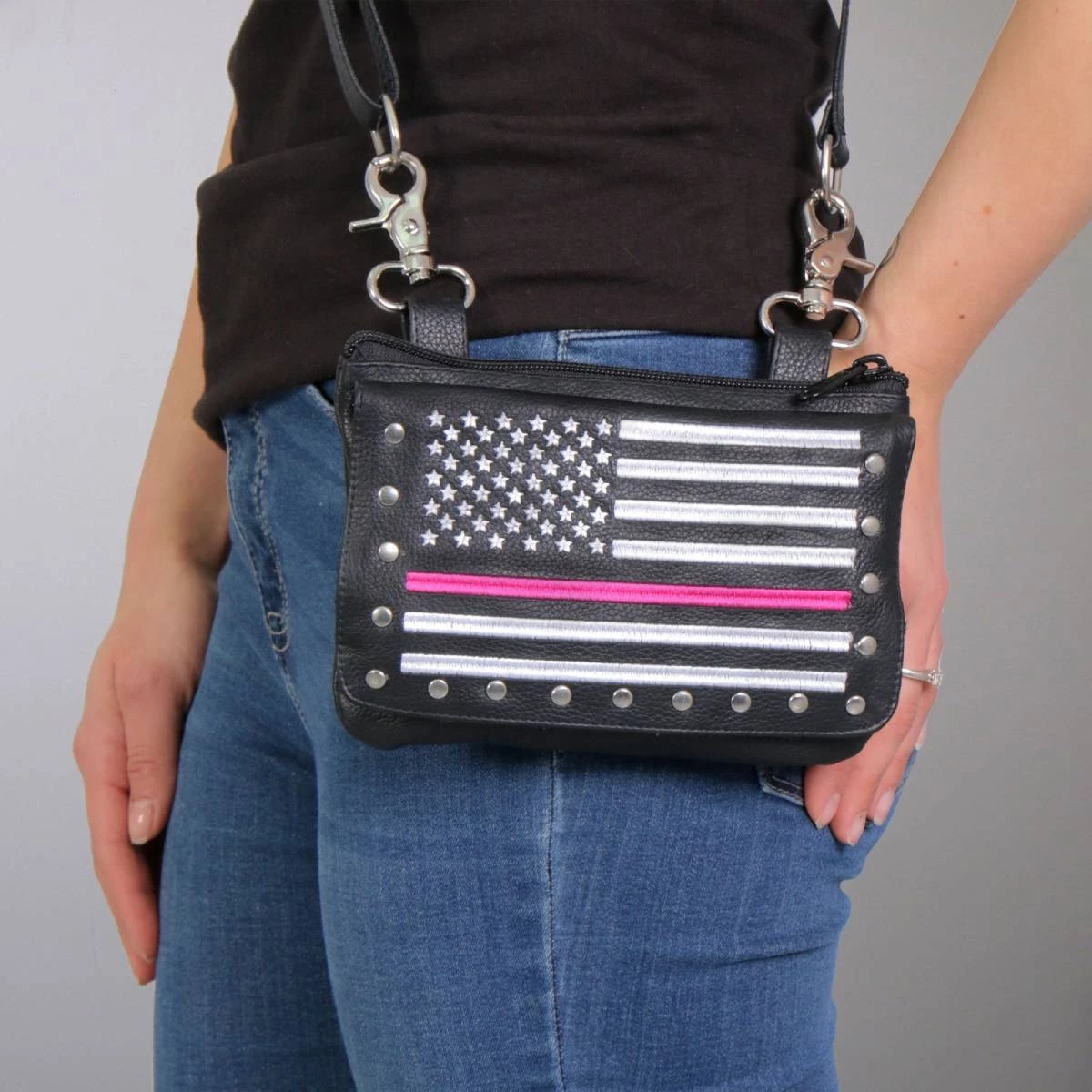 Pink line American flag embroidery highlights this great leather clip pouch/purse. It features a zipper open top with coin purse and ID slots. The flip over front has a magnetic snap closure and an inner lined pocket. The heavy claw closure is just the right size for your jeans. It comes with an optional leather strap that’s adjustable for your shoulder or cross body.