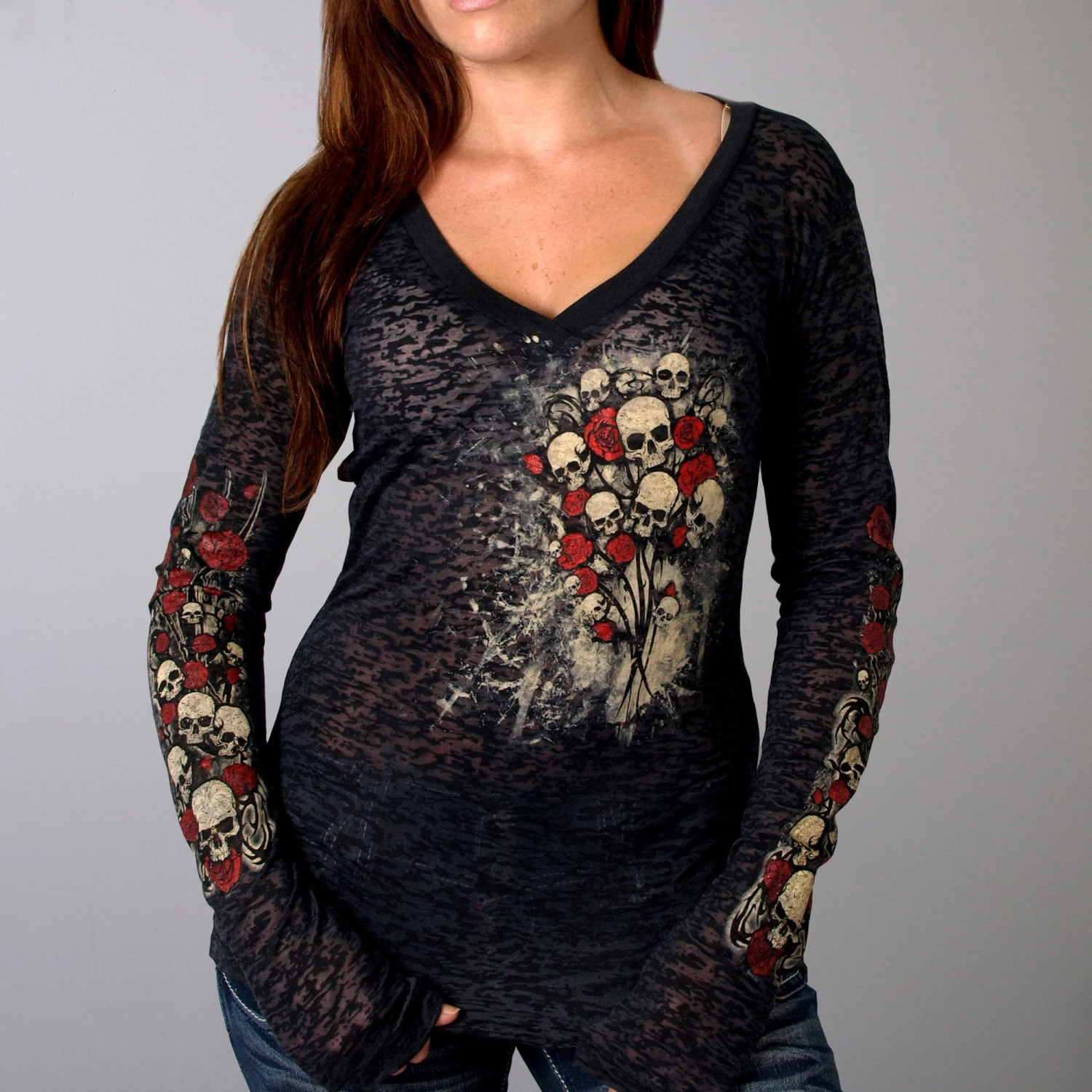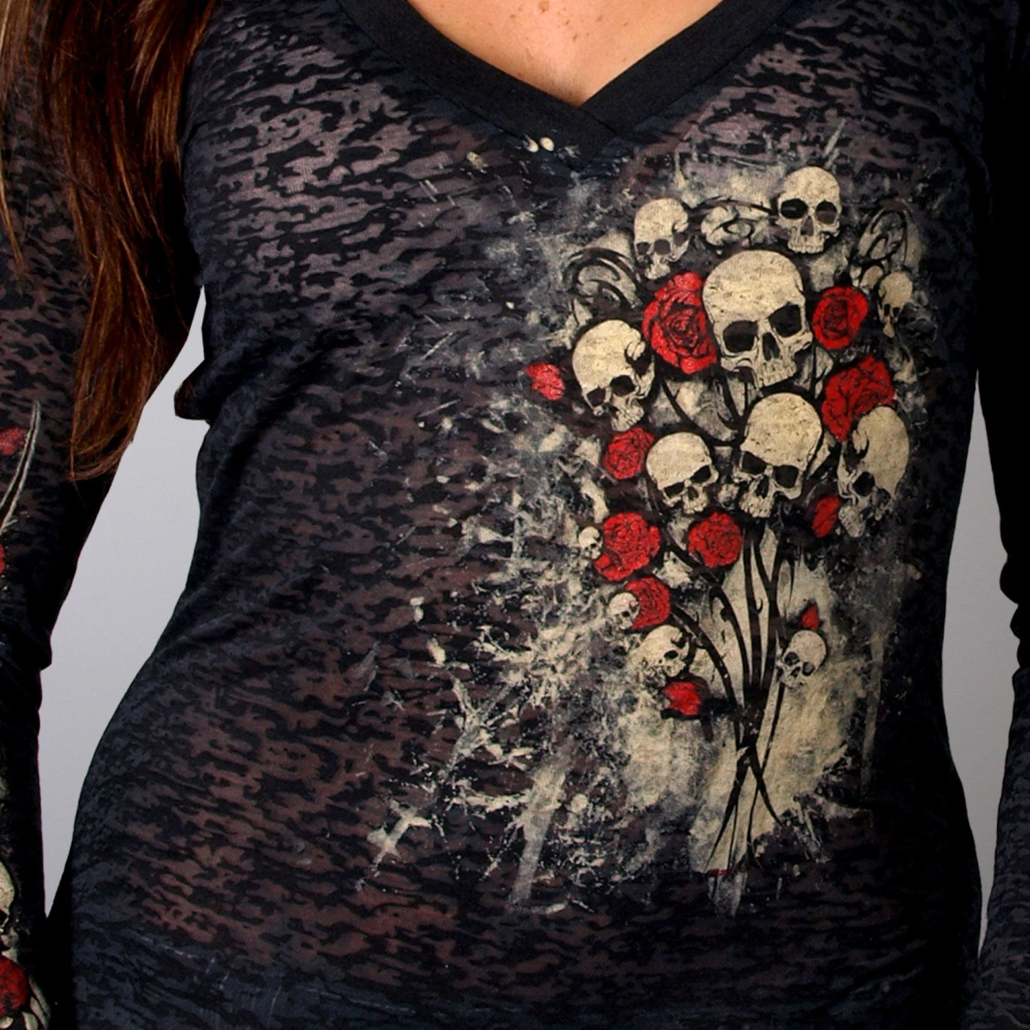 This ladies deep v neck long sleeve shirt in the color Black features a skull and red roses bouquet Design on the front as well as the sleeves. Due to the burnout process, each shirt will vary slightly in appearance.