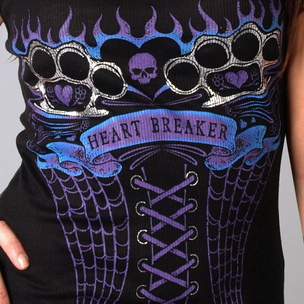 This form fitting tank features a bright, full color screen printed and silver foil ink Design of a corset with flaming brass knuckles and a skull and reads ‘Heart Breaker’.