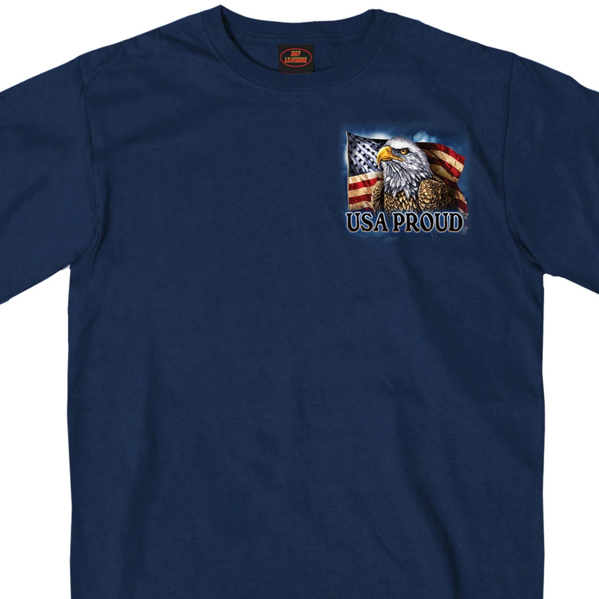 This Hot Leathers Exclusive Navy Blue men’s classic style t-shirt has an American Eagle and flag print on both the front left chest and back. “LAND OF THE FREE, HOME OF THE BRAVE” is printed on the back. While USA Proud is printed on the front left chest.