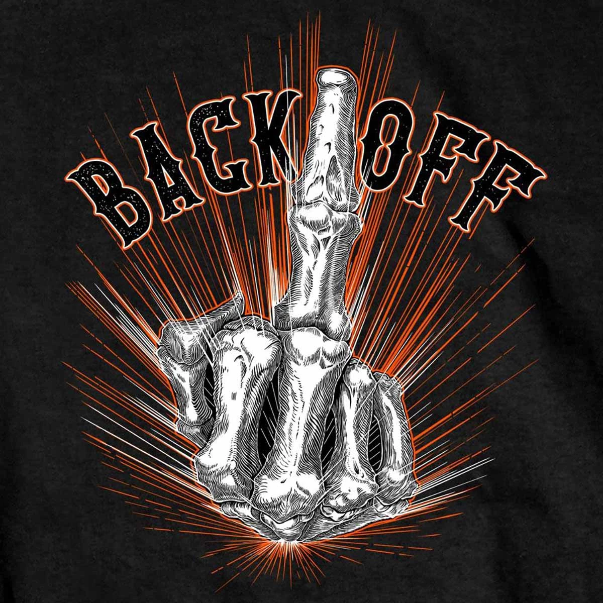 This 100% heavyweight Cotton men’s printed t-shirt comes in the color Black and features a vibrant, screen printed image of a bone finger with the words “BACK OFF”® proudly printed on the back. Get yours today!
