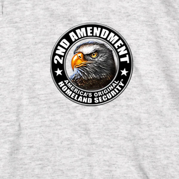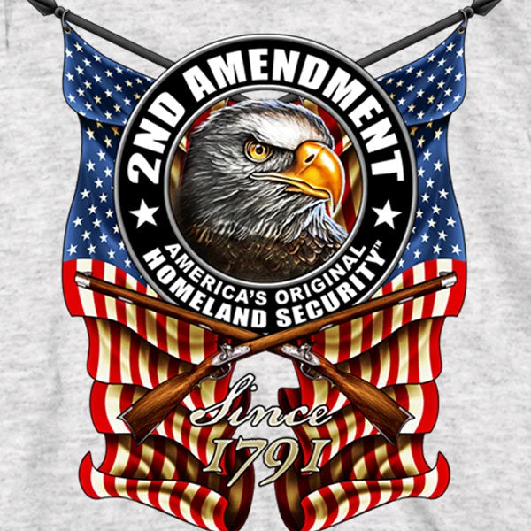 This double sided long sleeve men’s shirt in the color Ash features an original 2nd Amendment Eagle and Flags design on the back. A smaller version of this design is on the front, with flags both sleeves. Show off your support of the second amendment in this Hot Leathers exclusive.