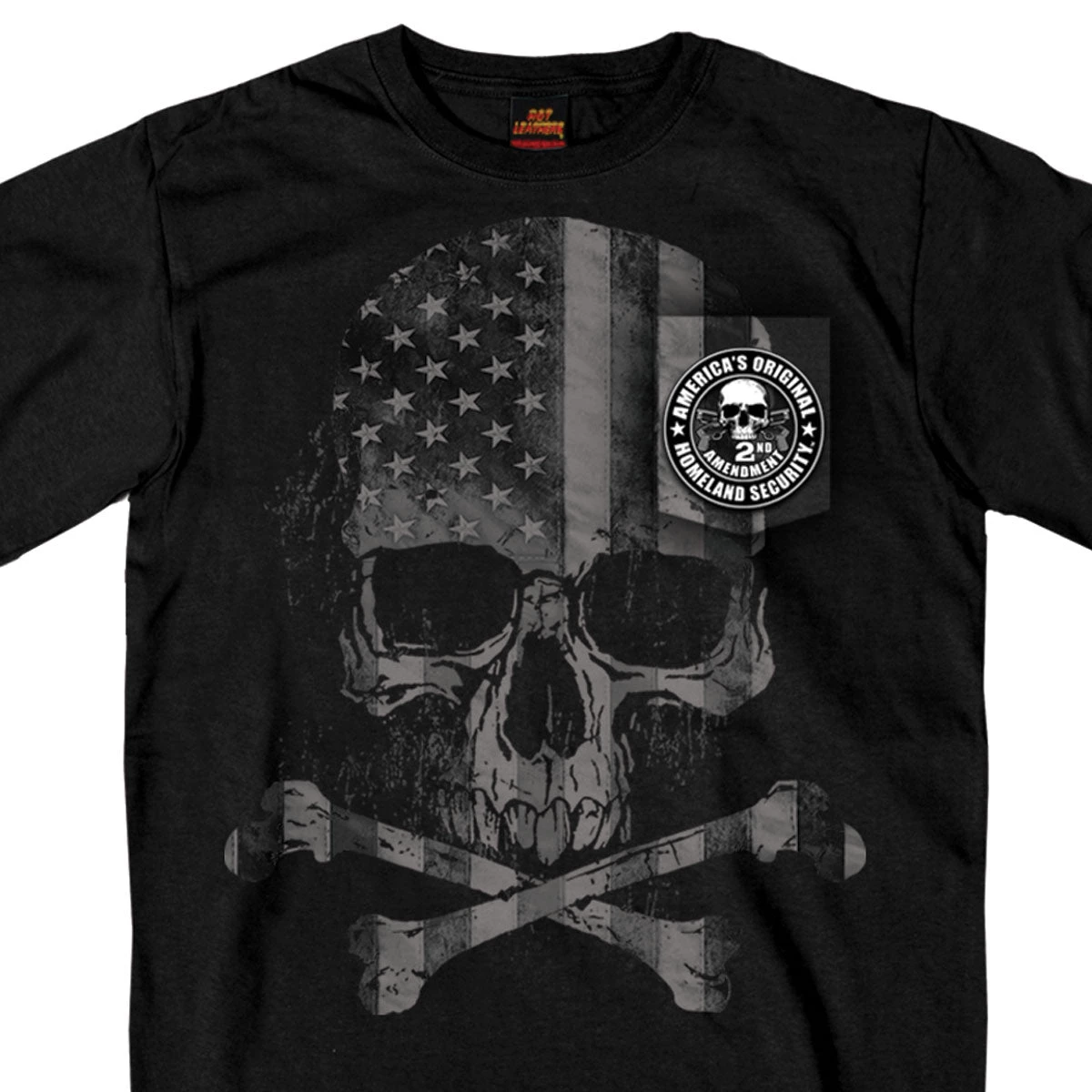 Hot Leathers original “Flag Skull” design screen printed on a black t-shirt. This tee displays a skull and crossbones with a black and white American flag overlay. On the left side chest is located a pocket with a printed patch like image of a skull with 2 pistols within his mouth and bordering the skull appears the words “AMERICA’S ORIGINAL HOMELAND SECURITY”..