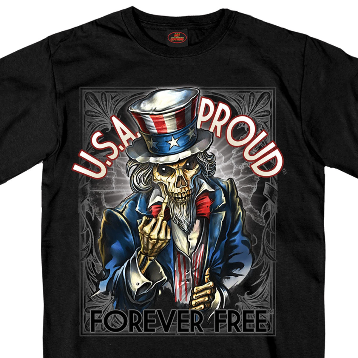 This men’s t-shirt in the color black features a screen printed image of a skeleton Uncle Sam giving the finger, surrounded by the text “U.S.A PROUD” & “FOREVER FREE”.