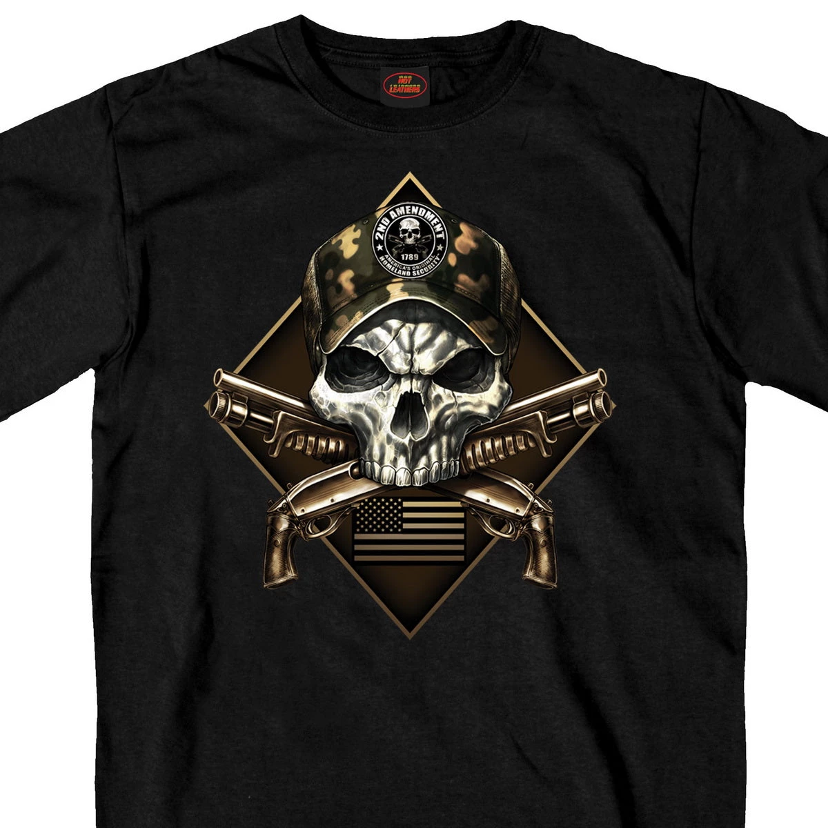 This Hot Leathers 2nd Amendment Camo Skull T-Shirt has a screen printed image of a skull wearing a camouflage cap with a patch on it reading “2ND AMENDMENT” and “AMERICA’S ORIGINAL HOMELAND SECURITY” with two pistols crisscrossed within the skulls mouth and an American flag proudly displayed underneath.