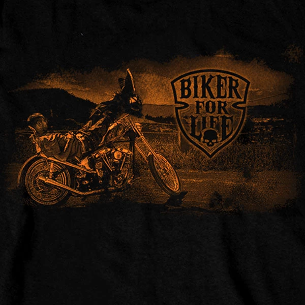 This men’s long sleeved shirt in the color Black features a screen printed image of a biker coolin’ on his motorcycle while overlooking scenic terrain with the text “Biker For Life” on the front and on the sleeves.