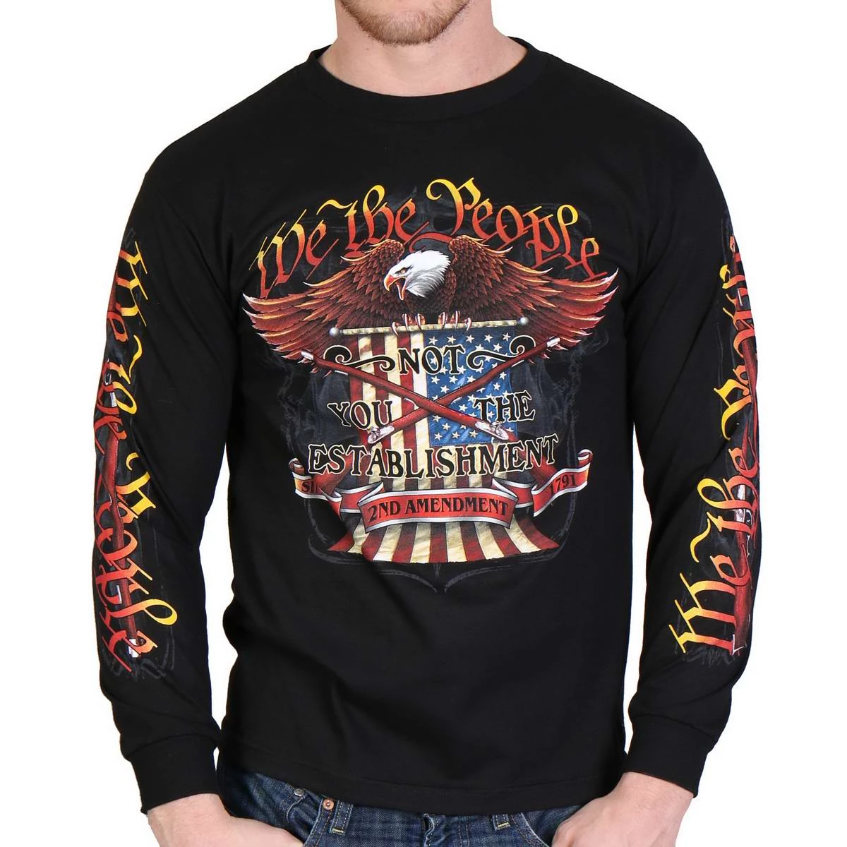 This men’s long-sleeved shirt in the color Black features the American Eagle perched upon the American flag. With his wings proudly spread out behind him. Above the eagle the text reads “WE THE PEOPLE” and located below upon the image of the American flag appears two crisscrossed riffles with the words “NOT YOU THE ESTABLISHMENT” and a banner stating “2ND AMENDMENT SINCE 1791”. Alongside the sleeves the words “WE THE PEOPLE” is printed again with a rifle through the text.