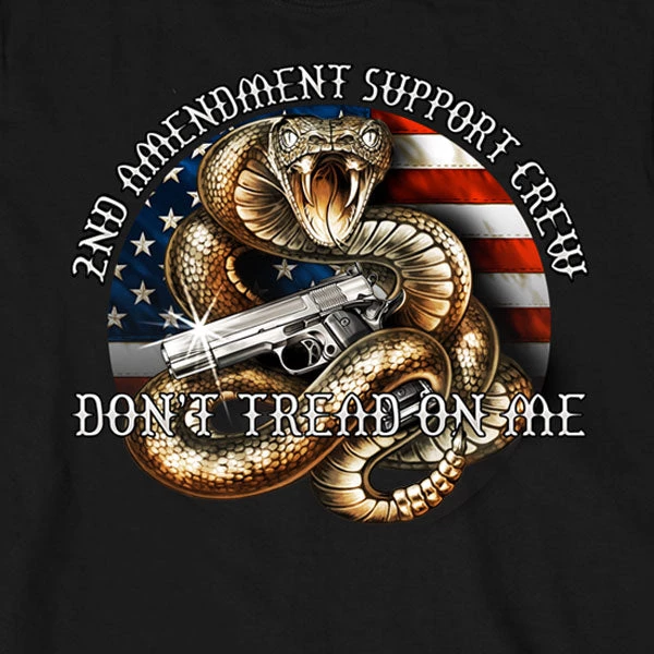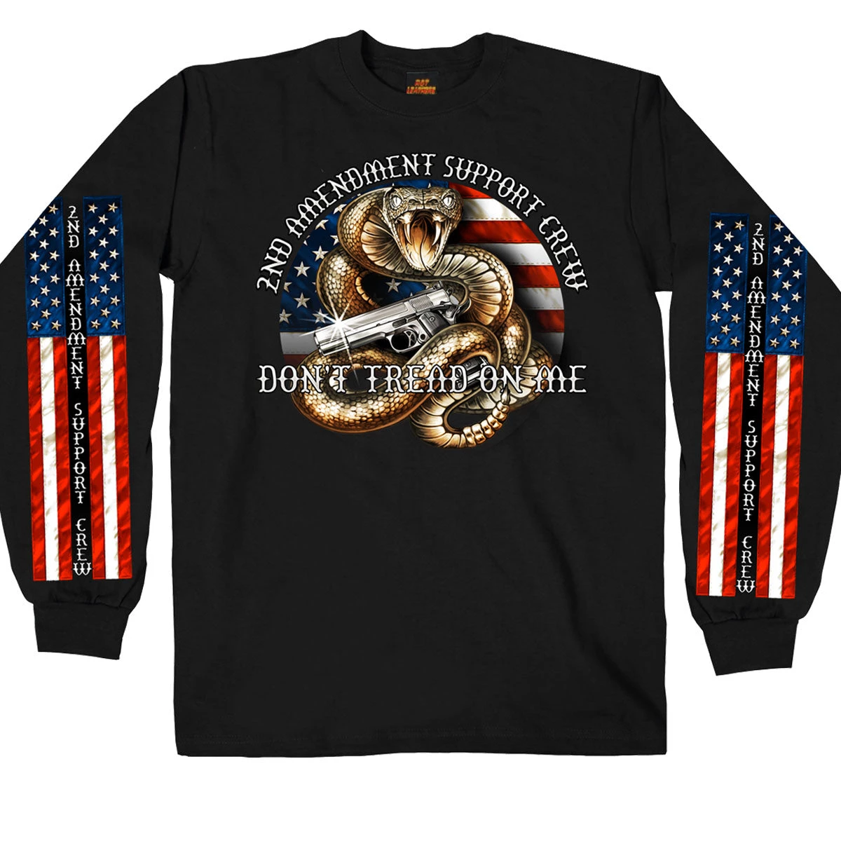 This front printed men’s long sleeve shirt in the color Black features Hot Leathers original “2nd Amendment Rattler” design. This T-Shirt proudly states “DON’T TREAD ON ME’ & “2ND AMENDMENT SUPPORT CREW”. Along the front side of the sleeves is printed the American flag with “2ND AMENDMENT SUPPORT CREW” vertically printed in the middle of the flag.