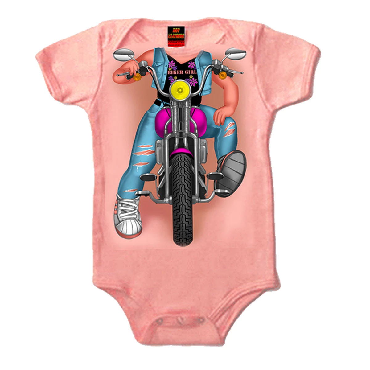 This baby bodysuit comes in the color pink and features a screen printed image of a “headless” biker girl starting at neckline.