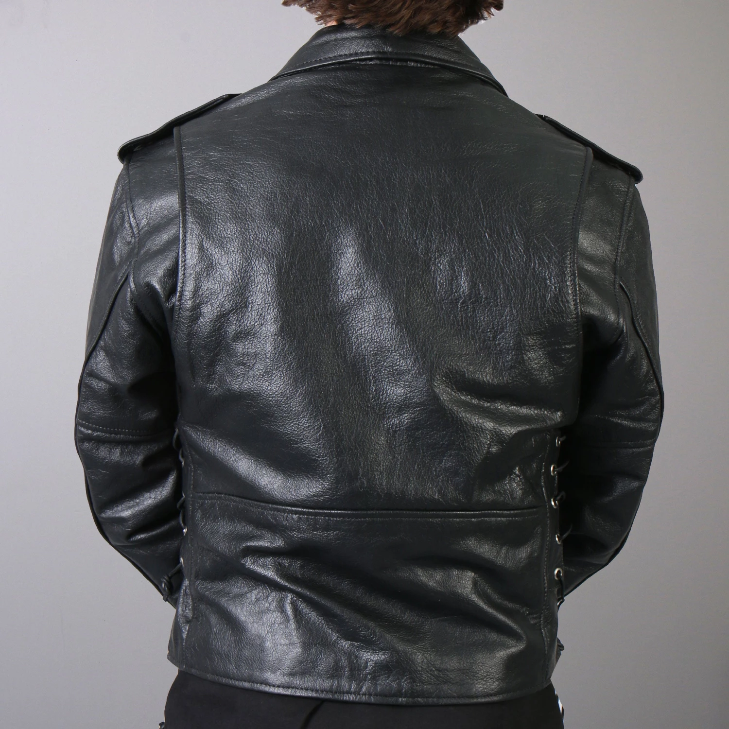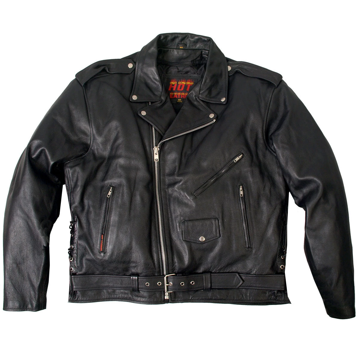 Men’s classic style jacket in a comfortable top grain leather. This jacket includes three outside zipper pockets, side lace, epaulets, and zipper cuffs. A half belt and silver hardware including belt buckle, snaps, loops, zippers and cowhide side lace add to the classic look of this leather jacket. This jacket does not come with leather zipper pull extensions. All our leather is handcrafted!