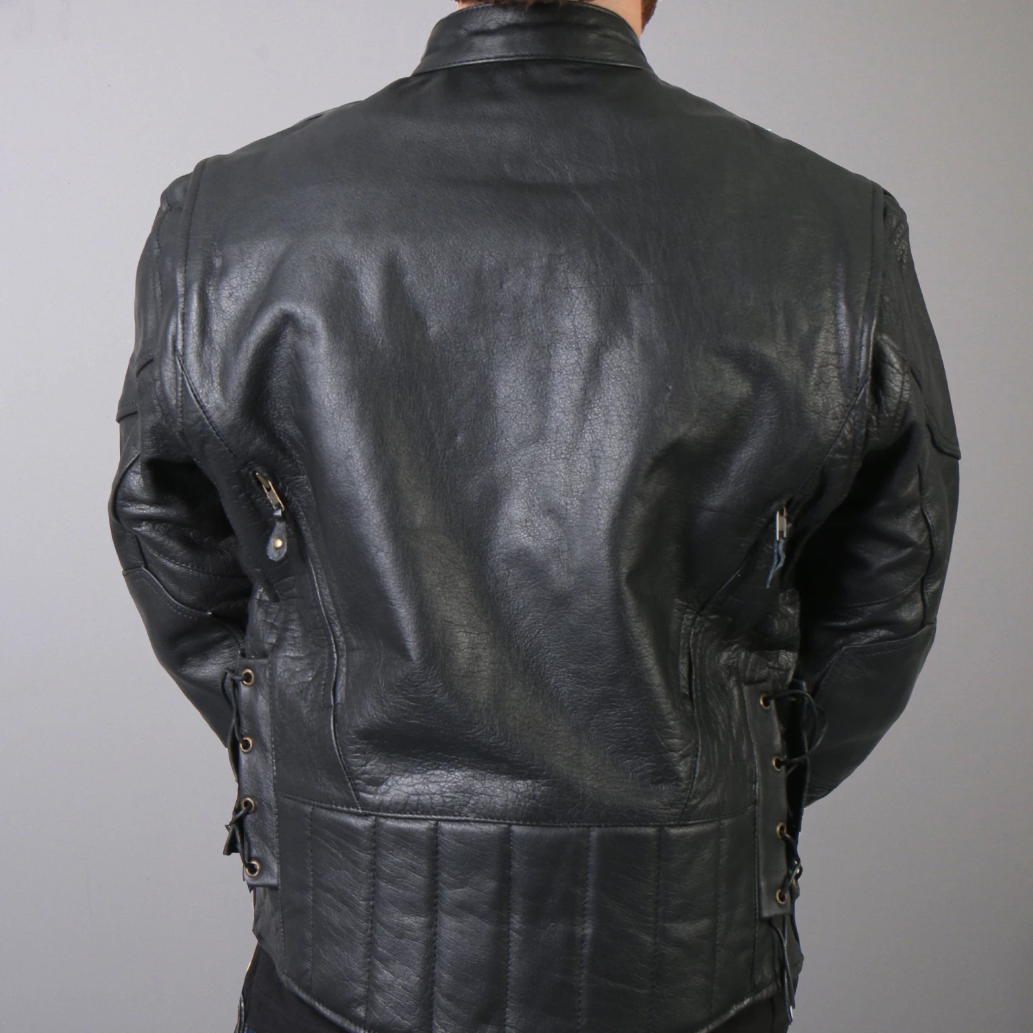 Men’s Vented Leather Motorcycle Jacket – This black motorcycle jacket is one of Hot Leathers Best Sellers! With full back vents, this jacket is great for year round comfort. This rider favorite also includes two front zipper vents, lower lumbar support, and reinforced elbows making your ride easy and effortless. This jacket also comes with lace-up sides for an adjustable fit, zip-out quilted lining, zipper cuffs, a large inside slash pocket, and two front leather lined zipper pockets. This jacket does not come with leather zipper pull extensions.