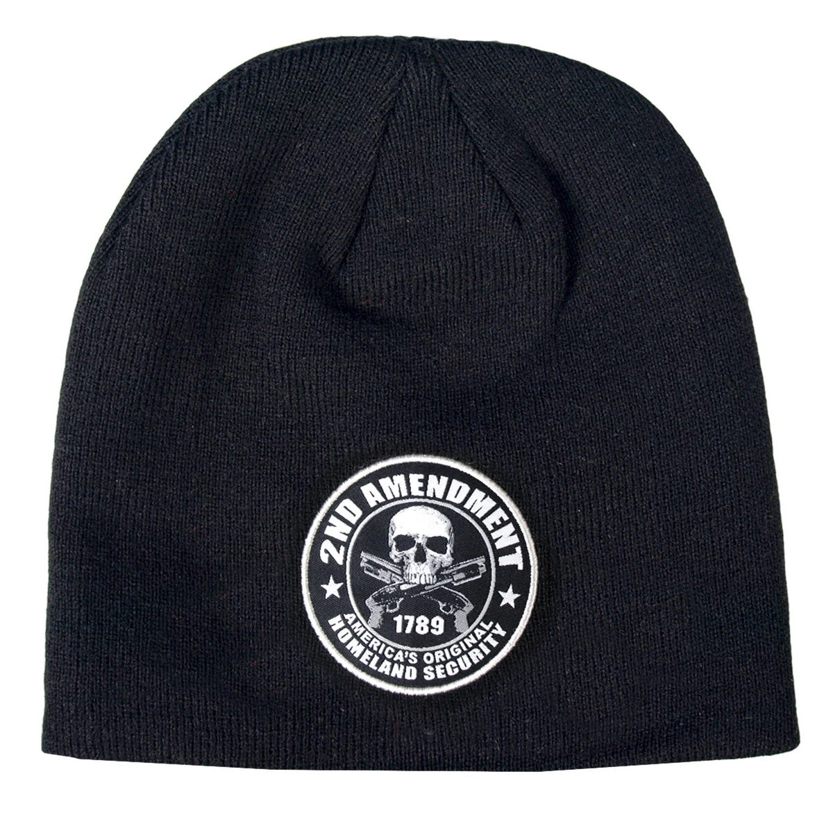 Keep your head warm during cold weather riding in the 2nd Amendment Skull Knit Cap! This one size fits all, black knit cap features an original embroidered design of a skull with two crossed pistols encircled in the text “2nd Amendment 1789, America’s Original Homeland Security”.