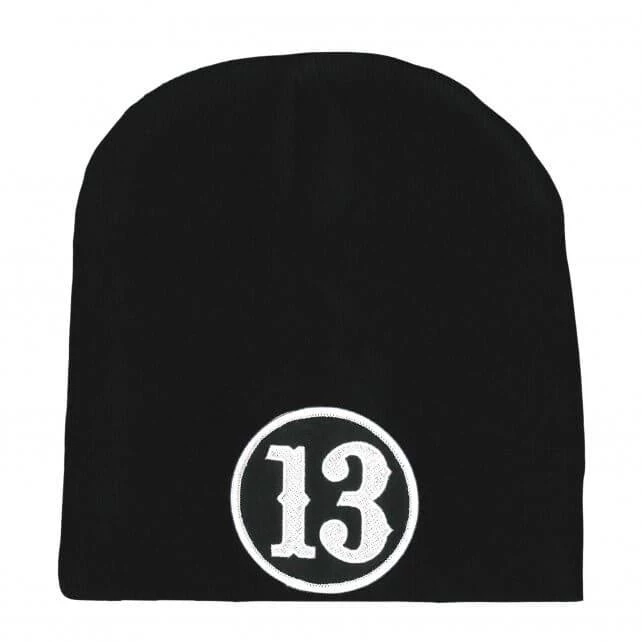 This Hot Leathers® Knit Hat has an embroidered patch of white circle encompassing the number 13 on front.