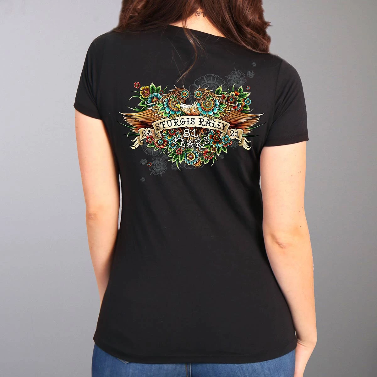 Official 2021 Sturgis Ladies Black ‘Motorcycle Rally Tattoo Eagle’ Short Sleeve T-Shirt