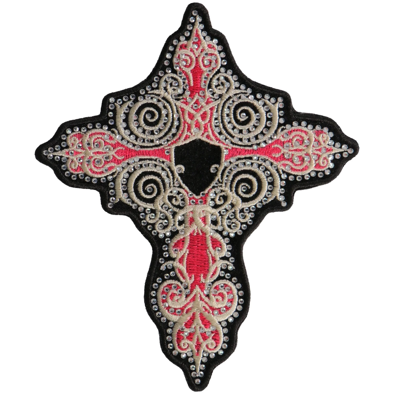 This embroidered cross features intricate detail and is embellished with rhinestones.