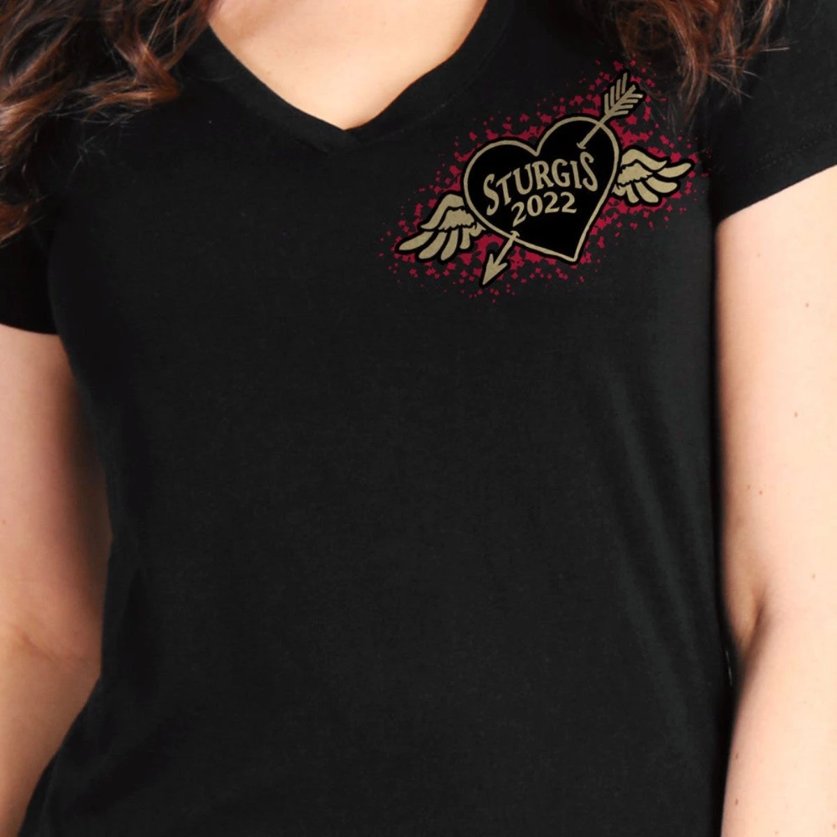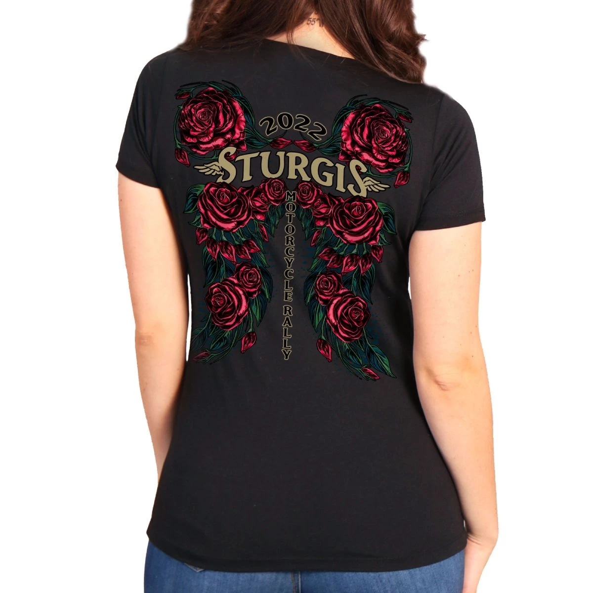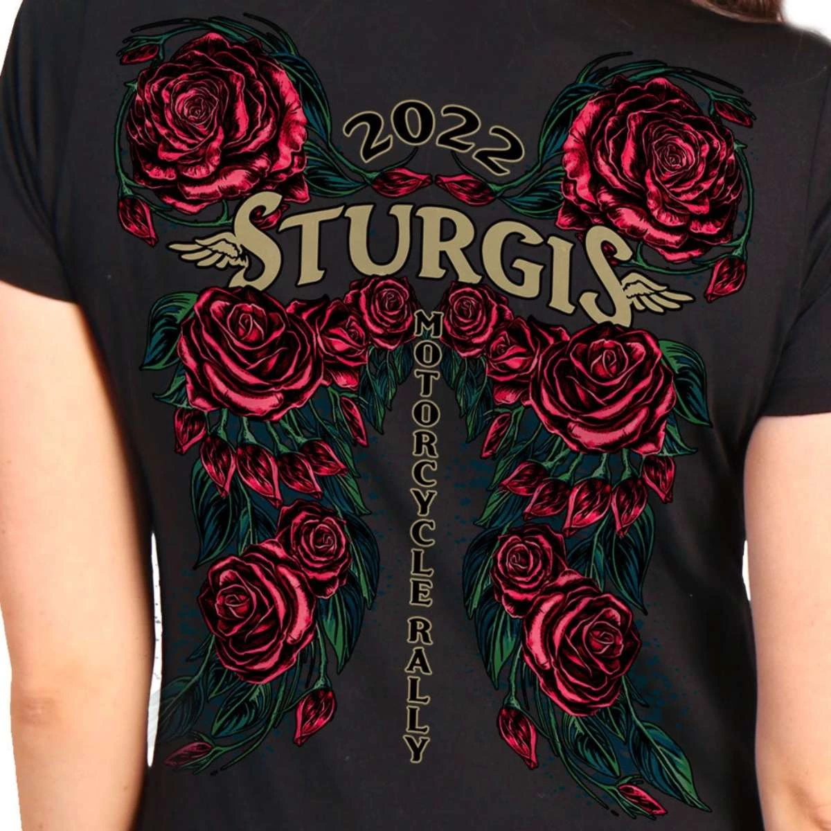 2022 Sturgis Motorcycle Rally SPL1793 Ladies Black Rose Wings T Shirt