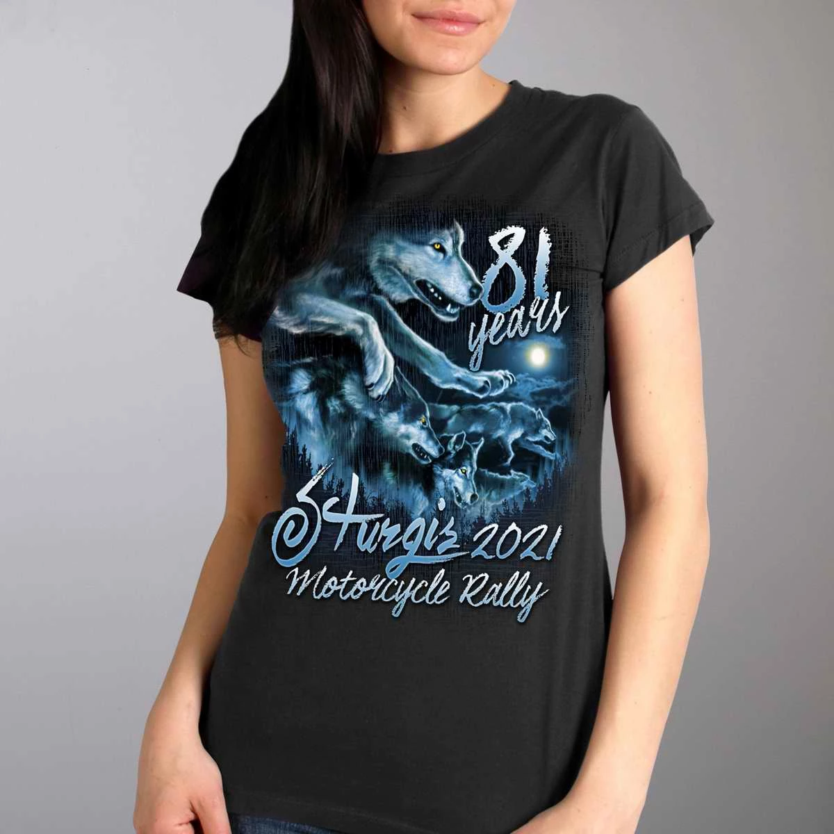 Official 2021 Sturgis Motorcycle Rally SPL1736 Ladies Black Wolf Pack T Shirt