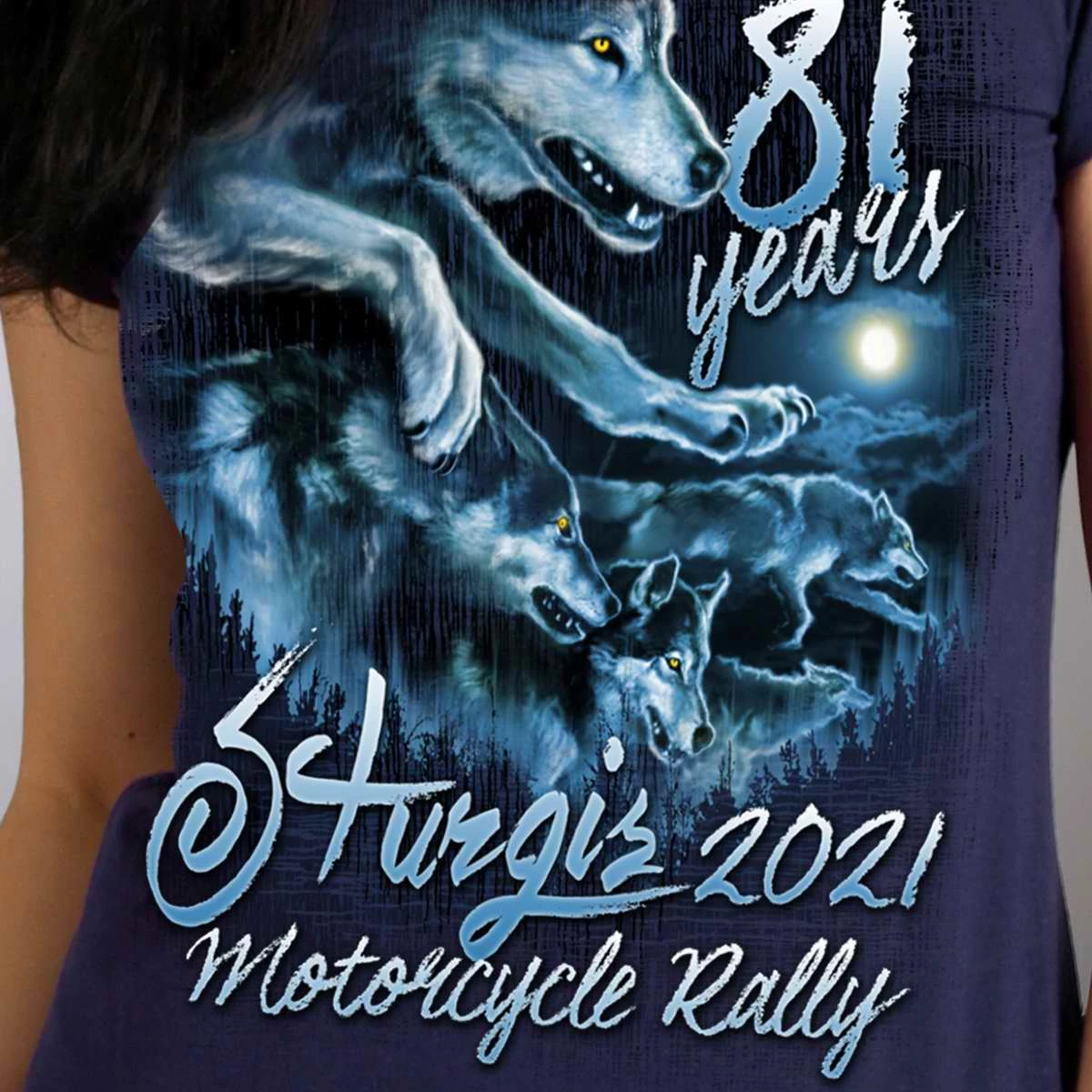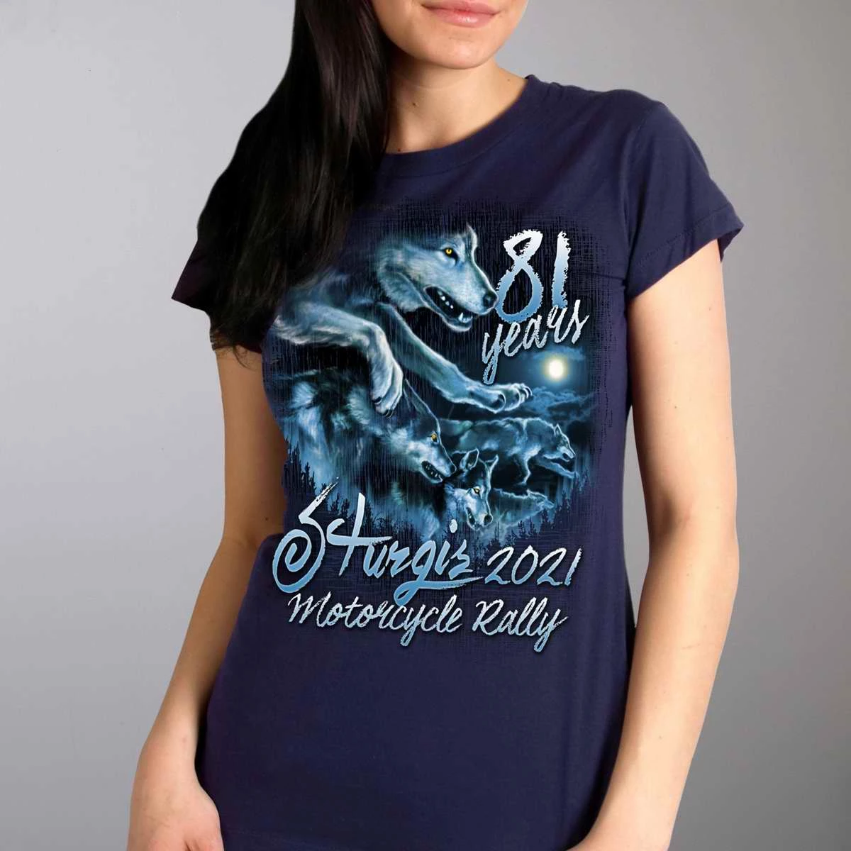 Official 2021 Sturgis Motorcycle Rally SPL1737 Ladies Navy Blue Wolf Pack T Shirt