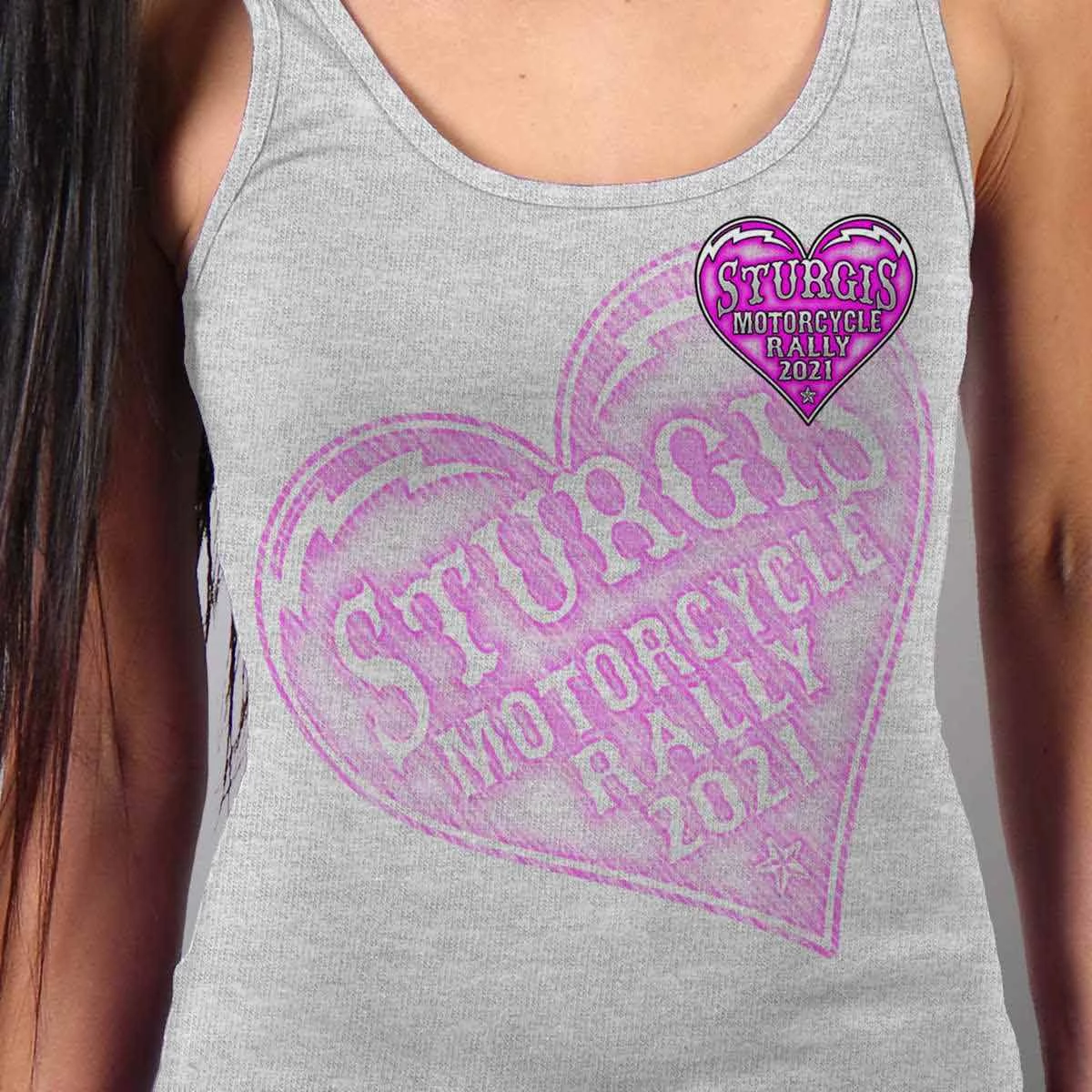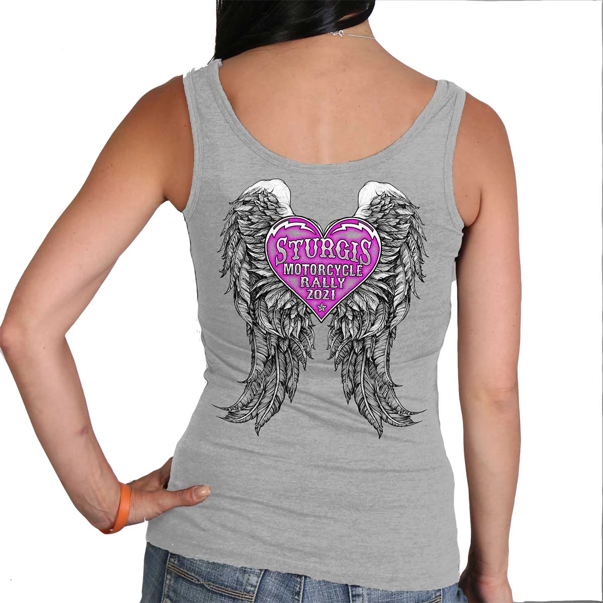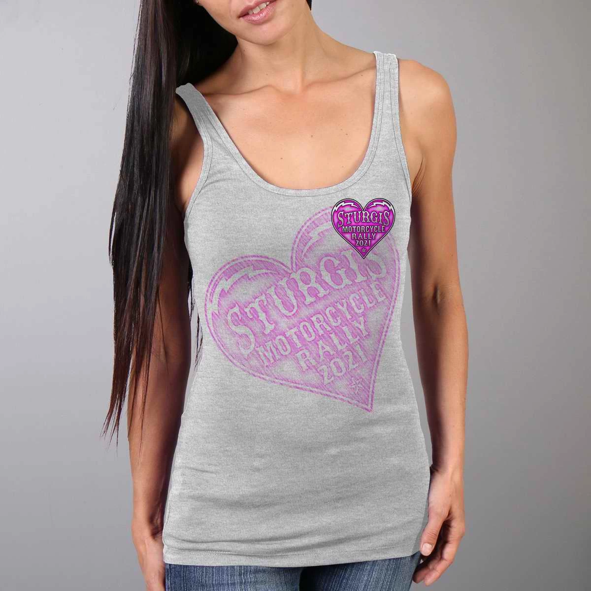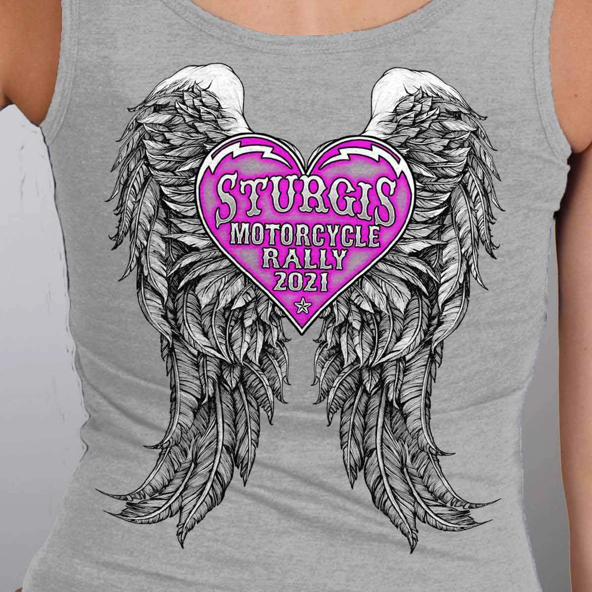 Official 2021 Sturgis Motorcycle Rally SPL2754 Ladies Heather Gray Heart Angel Wings Tank Top