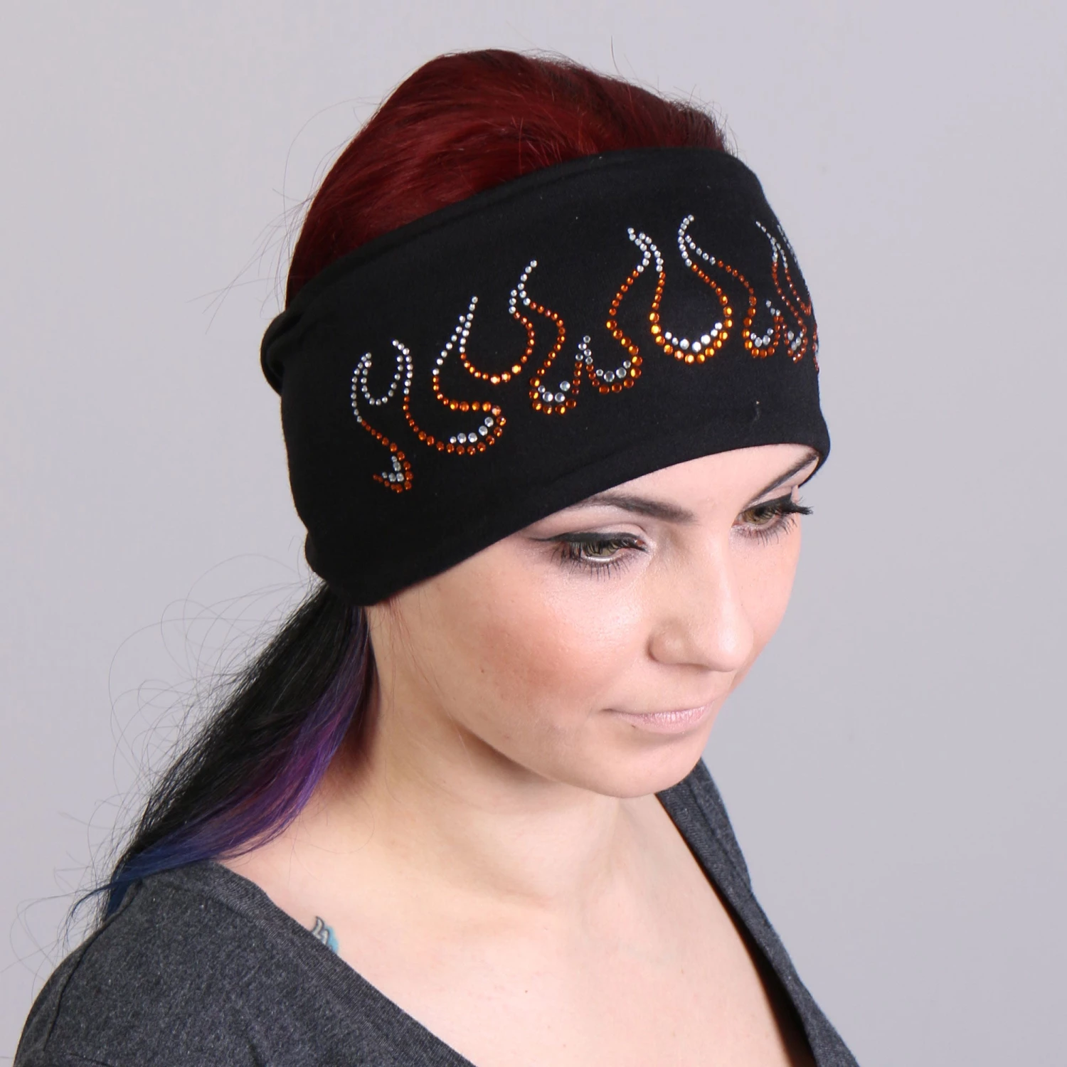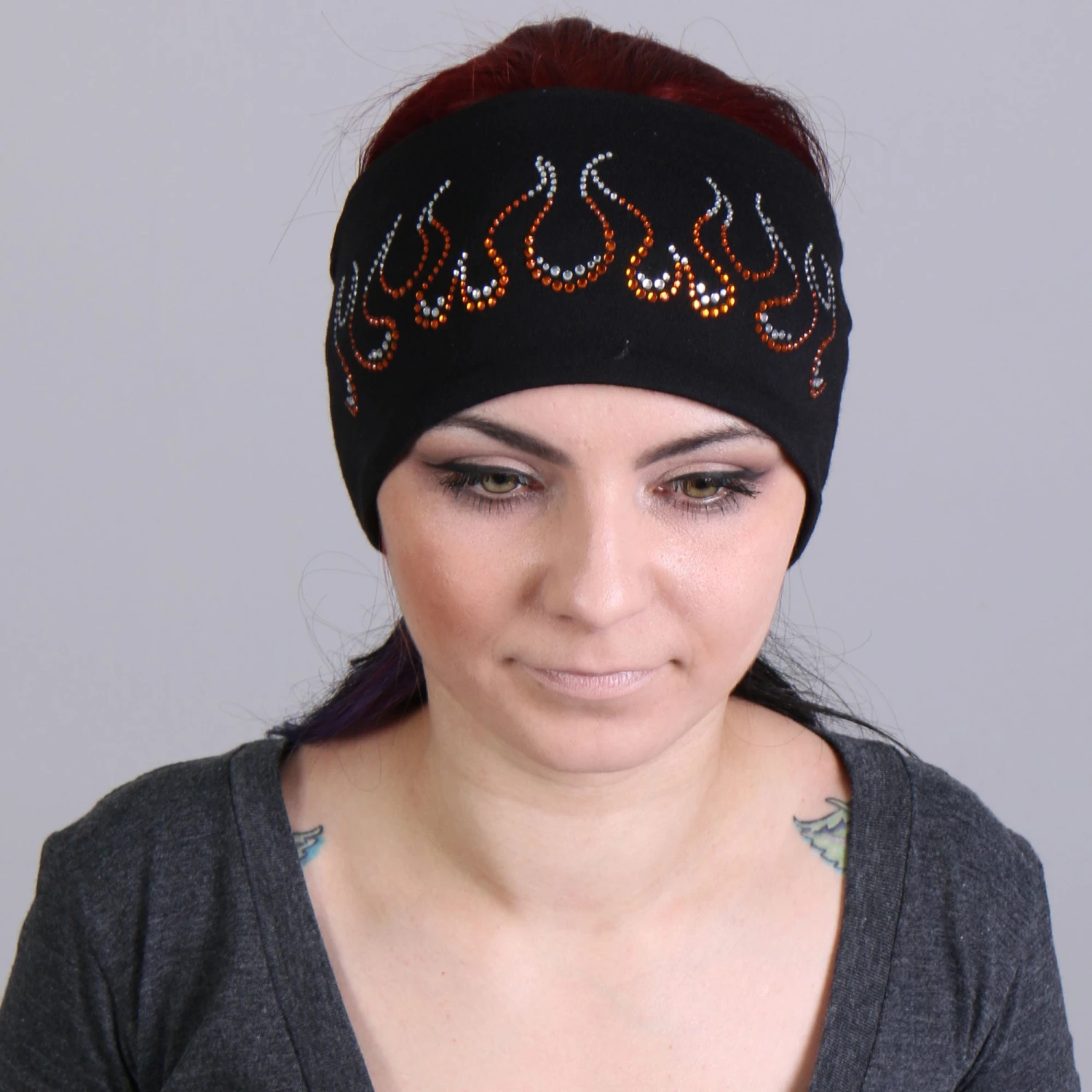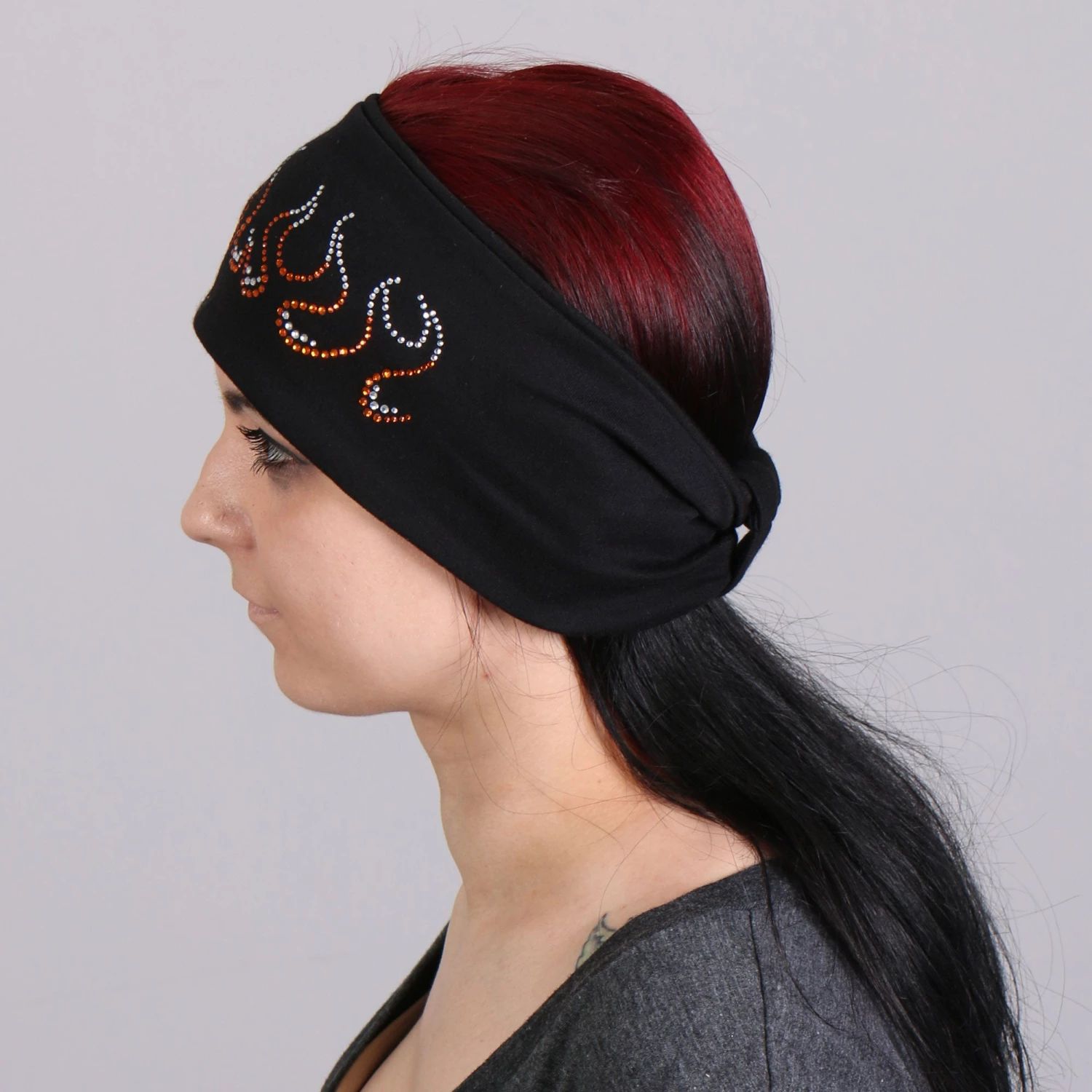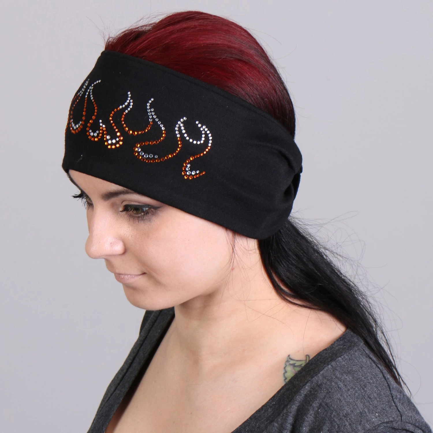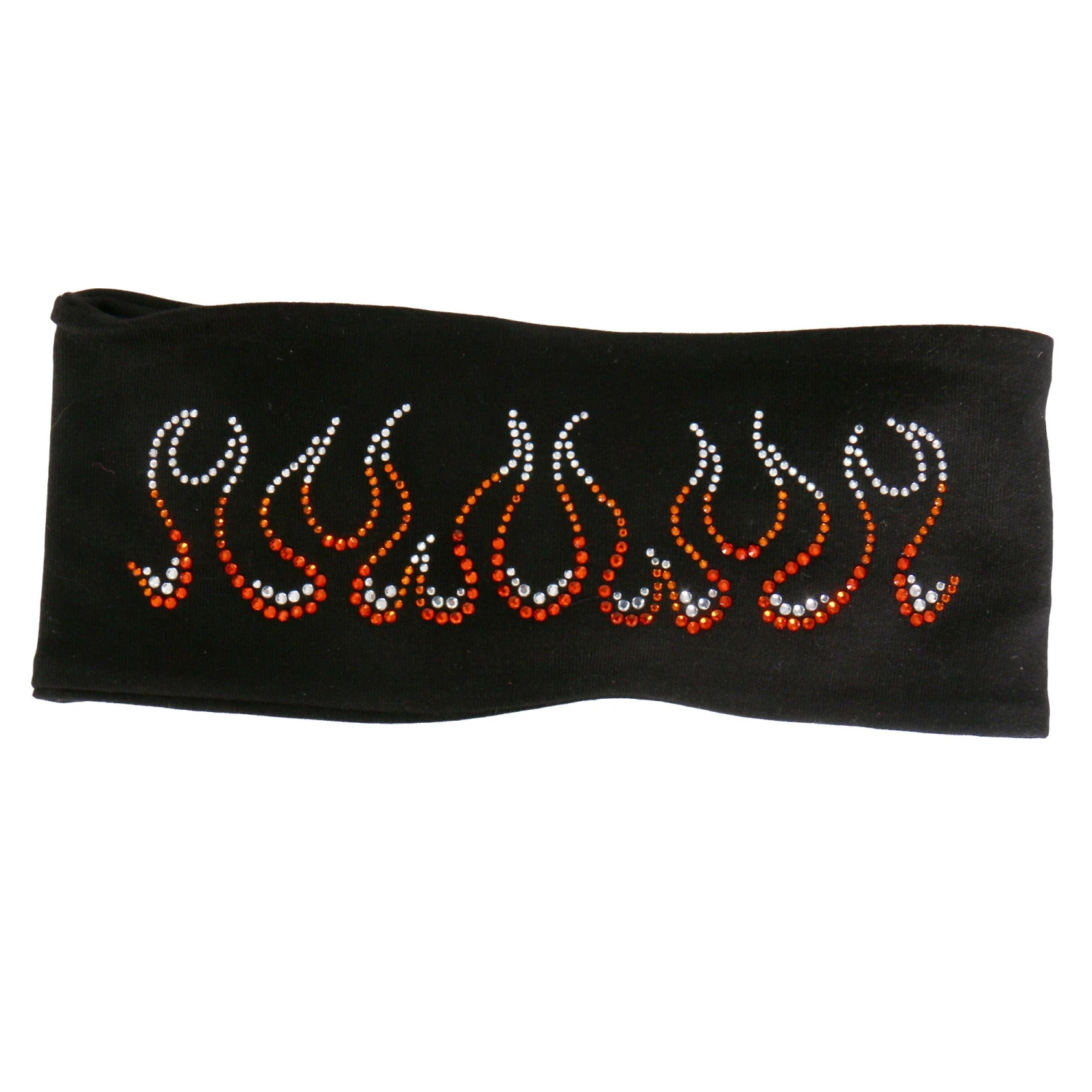 This wrap features a flame design all along the front. Make a statement the next time you hit the road wearing an exclusive Hot Leathers® Bling Wrap! A one size fits most biker hair wrap that is soft, durable, and designed with the fashionable road diva in mind! Beautiful, sparkling rhinestones come together to create an eye catching design.
