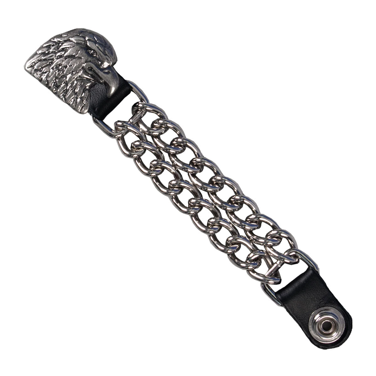 An American made double chain vest extender with a Eagle Head medallion. Great for any vest, this extender is made of silver chain links and leather with a silver snap, designed to attach to your vest snaps and make for a better fit. Ride in biker style with the Hot Leathers Motorcycle Vest Extender. Order yours today!