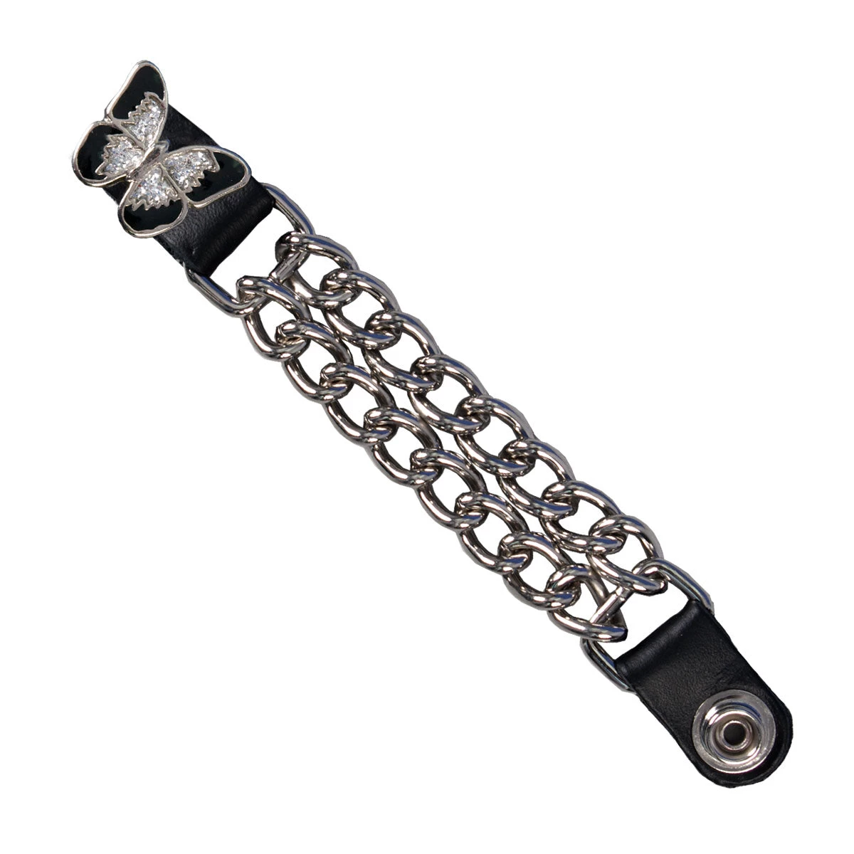 An American made double chain vest extender with a Sparkle Butterfly medallion. Great for any vest, this extender is made of silver chain links and leather with a silver snap, designed to attach to your vest snaps and make for a better fit. Ride in biker style with the Hot Leathers Sparkle Butterfly Vest Extender. Order yours today!