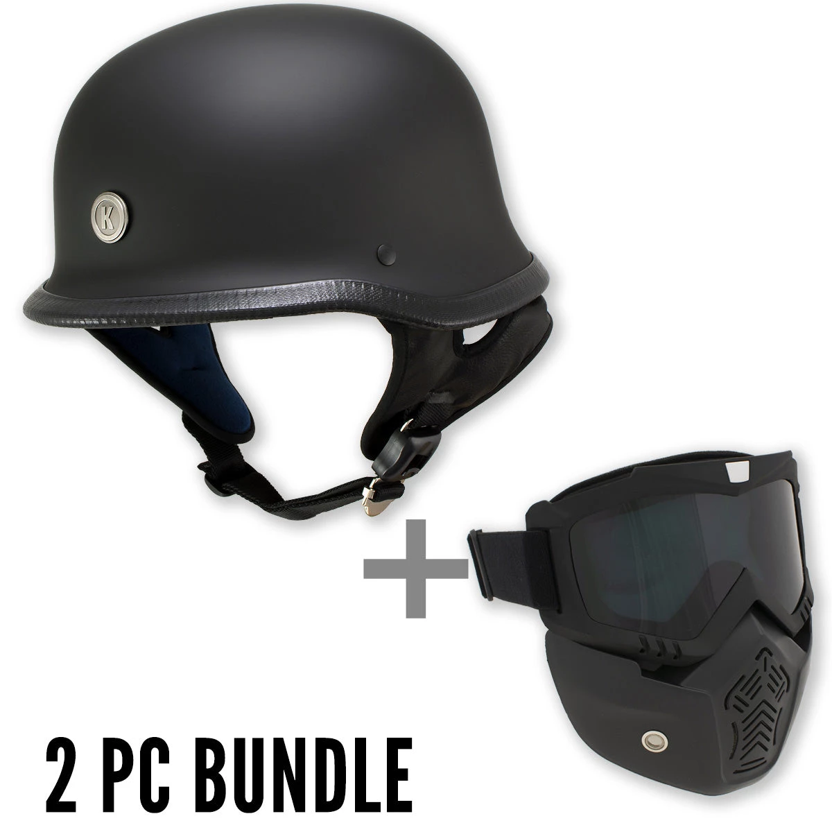 Klutch K-10 Bundle ‘Das Hammer’ Flat Black German Half Face Helmet with MP7921FM ‘Drift’ Face Mask and Detachable Motorcycle Goggles