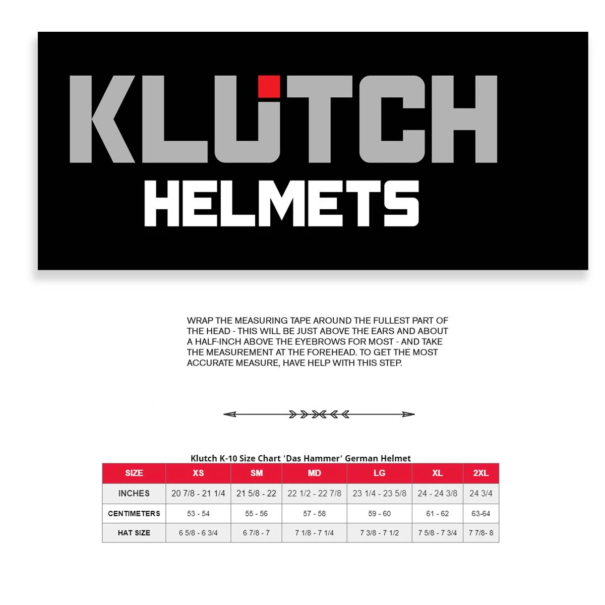 Das Hammer (Wicked in German Slang) by Klutch Helmets is the ultimate open face helmet featuring a polycarbonate shell, and Klutch K logo emblem on the front and a sleek vintage German helmet design. Klutch helmets are made to enhance the riding experience and maximize safety and comfort. Meets or exceeds DOT certification. Unique Polycarbonate materials allow for a snug sleek fit on the head and are less heavy than normal helmets with maximum protection. Polycarbonates are the strongest group of thermoplastic polymers and polycarbonate material provides a higher degree of protection and impact absorption than normal half helmets.
