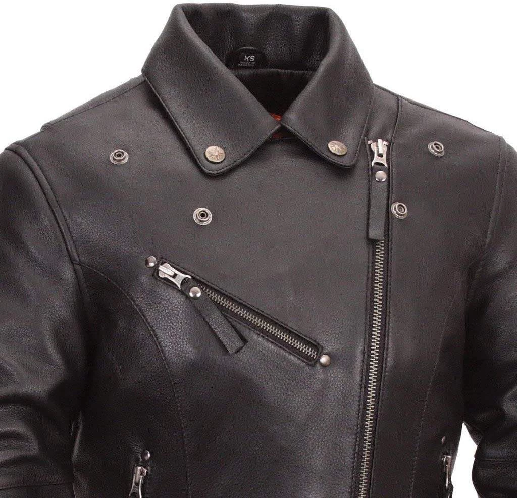 First Manufacturing Women’s Riveted Classic Motorcycle Jacket features soft milled naked cowhide 1.1-1.2 millimeter. It has back, side and cuffs with antique silver rivet detailing. It has an adjustable collar to change the look from MC to cruiser jacket. It has three outside zipper pockets, one vertical zippered and one horizontal open inside pockets for storage. It has a full leather action back and matching stretch panels on removable liner for comfortable wear and protection against tearing. It has a zip-out, full-sleeve, high performance insulated thermal liner for extra warmth. The removable liner uses heavy duty long lasting black polyester lining with custom first classic orange mesh trimming and ever popular first classic orange label. It has heavy snaps and original YKK zippers. It is non-rusting and non-corroding.