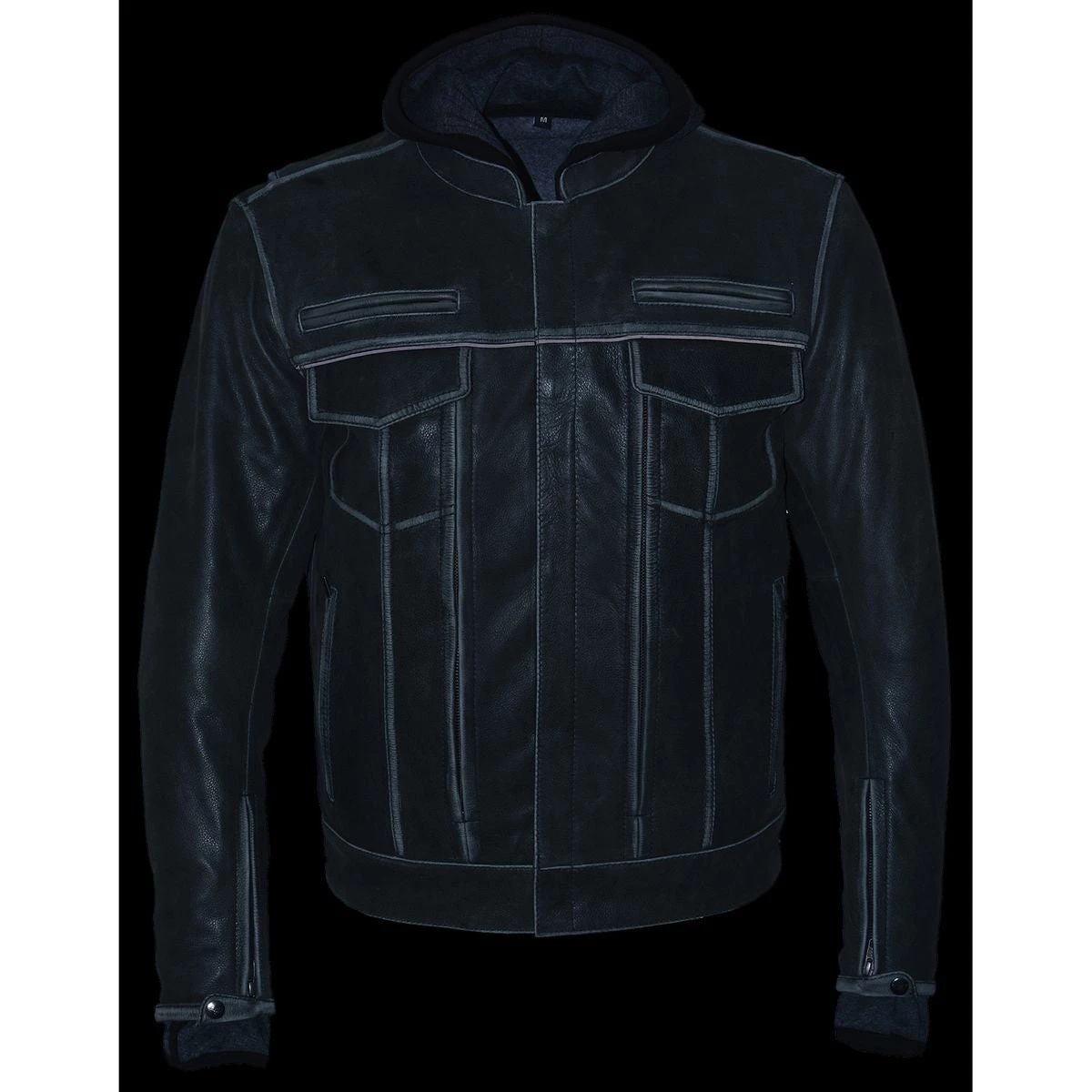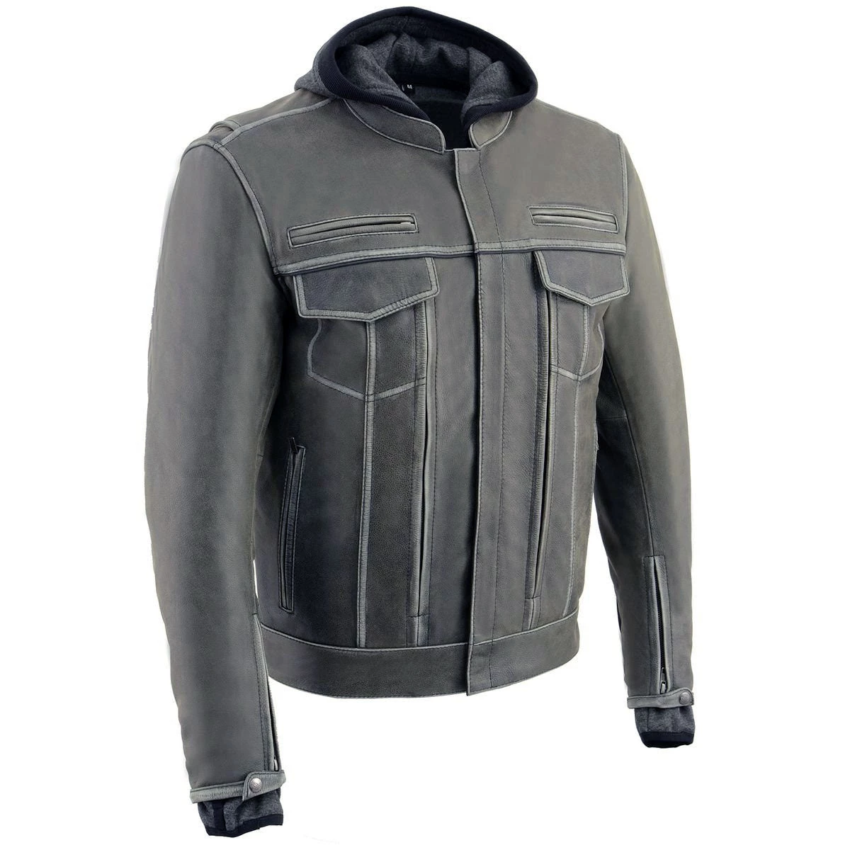 Milwaukee Leather MLM1539 Men’s Distressed Grey Leather ‘Utility Pocket’ Vented Jacket with Removable Hoodie