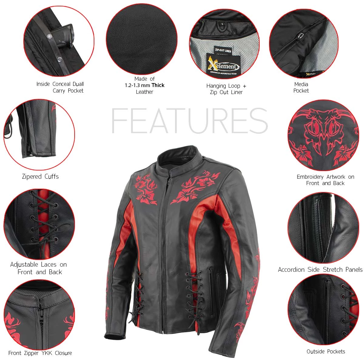 Xelement XS2029 Women’s ‘Gemma’ Black and Red Leather Embroidered Jacket with X-Armor Protection