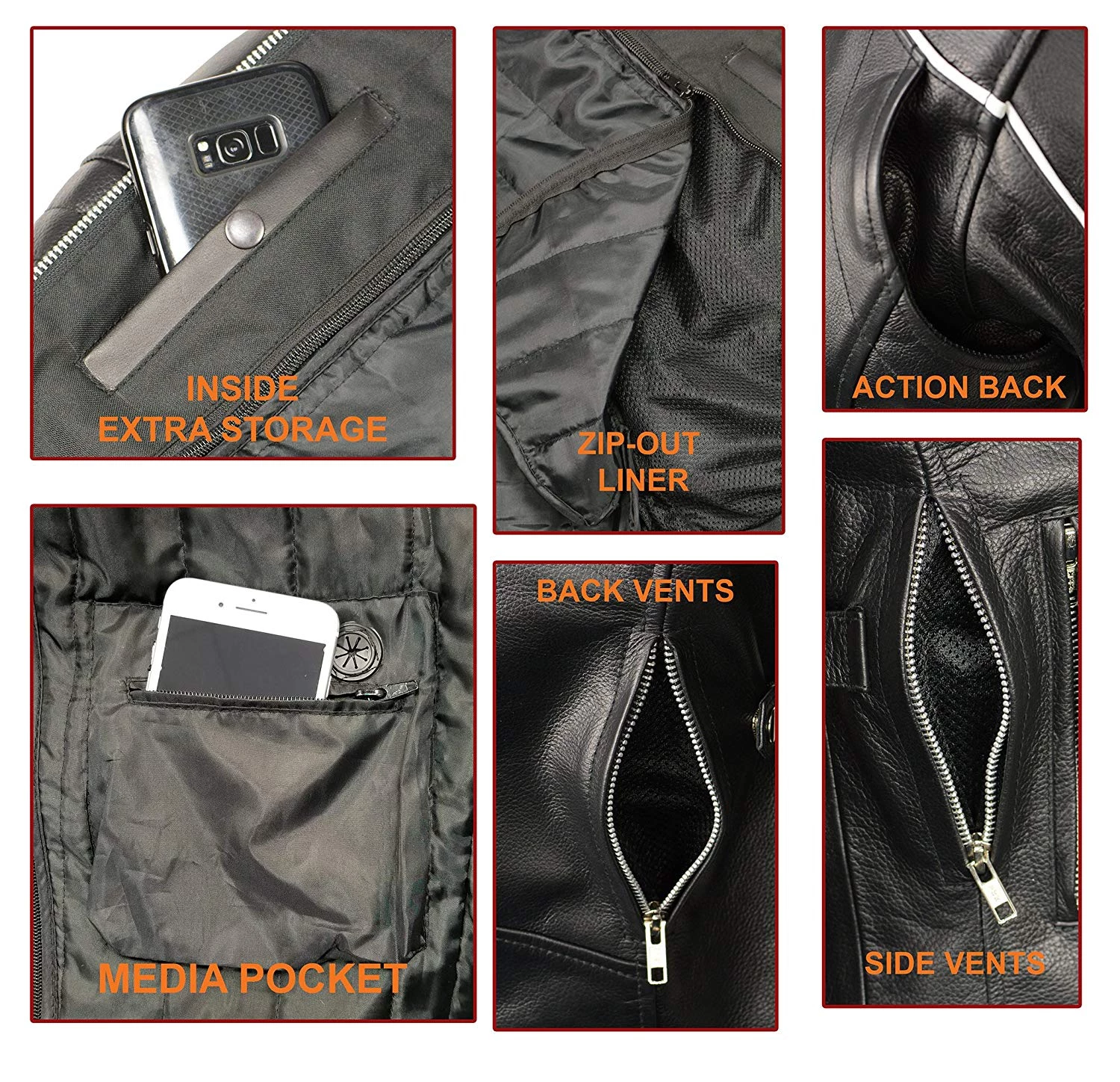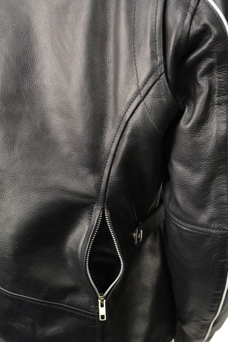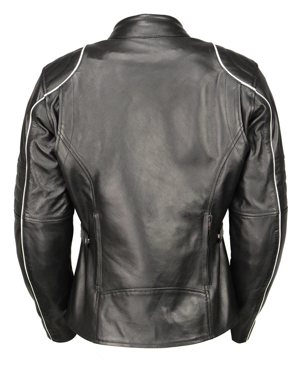 M Boss Motorcycle Apparel BOS22504 Ladies Black Leather Jacket with Full Armor and White Piping