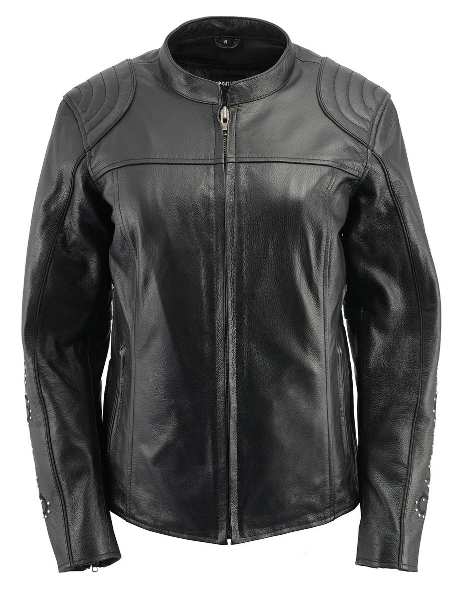 M Boss Apparel BOS22501 Ladies Black Leather Scuba Jacket with Full Armor and Wing Embroidery