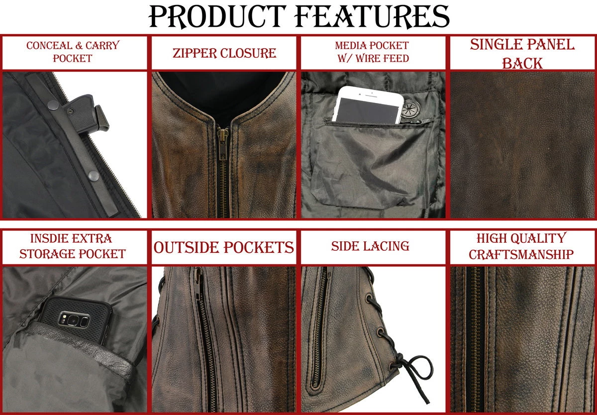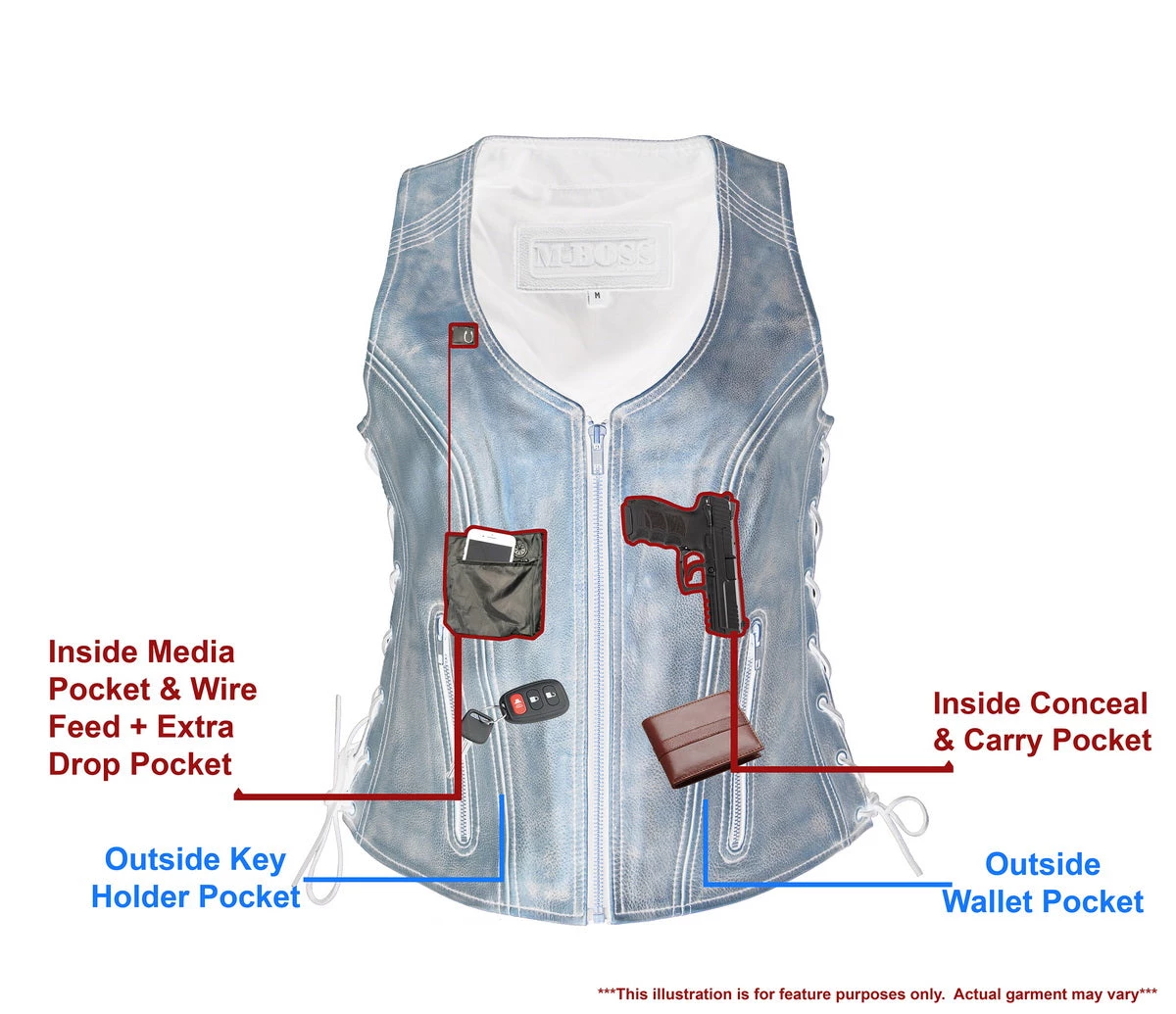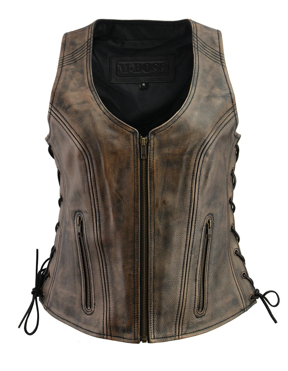 M Boss Apparel BOS24503 Ladies Black and Beige Leather Side Lace Zipper Front Vest