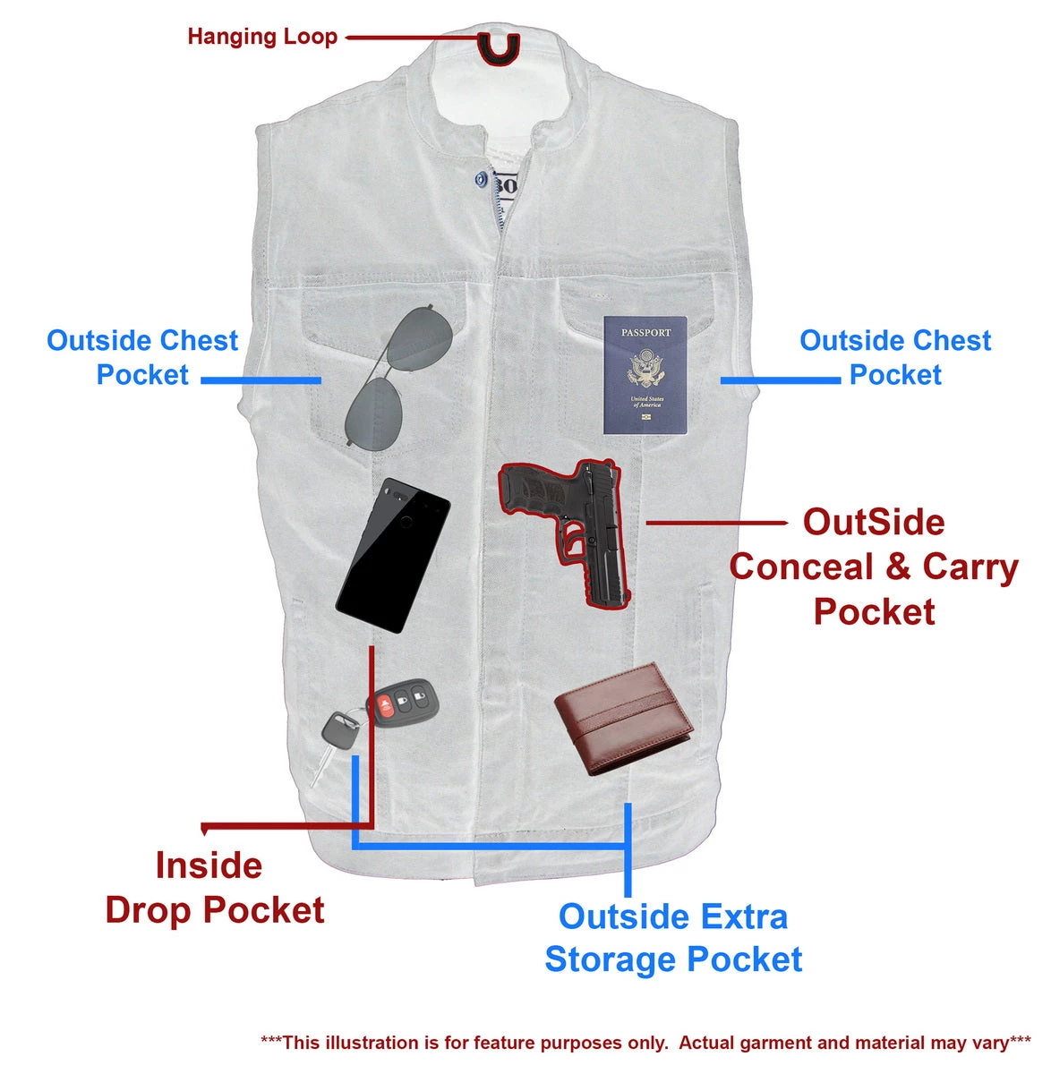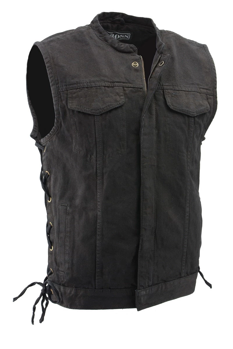 M Boss Motorcycle Apparel BOS13002 Mens Black Denim Club Style Side Lace Vest with Hidden Zipper