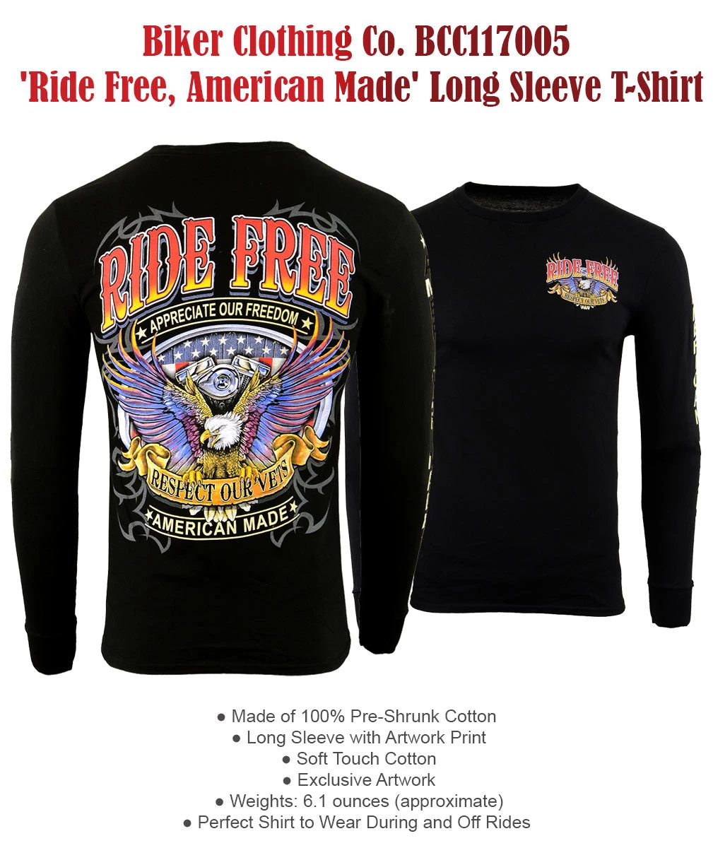Biker Clothing Co. BCC117005 ‘Ride Free, American Made’ Long Sleeve T-Shirt