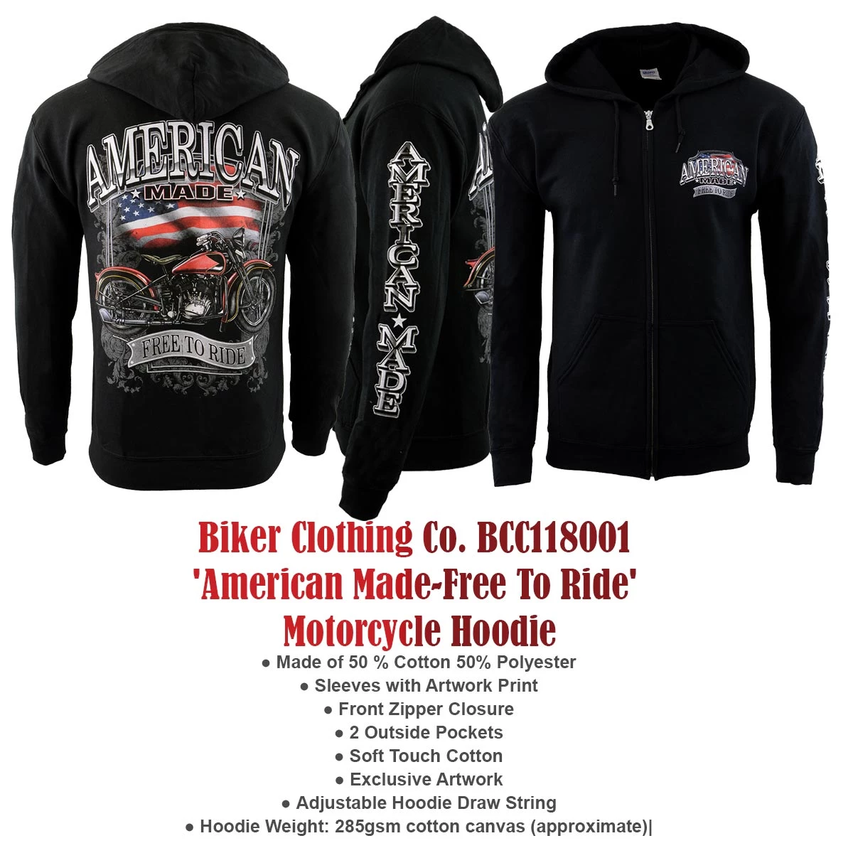 Biker Clothing Co. BCC118001 ‘American Made-Free to Ride’ Motorcycle Hoodie